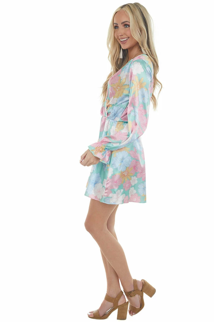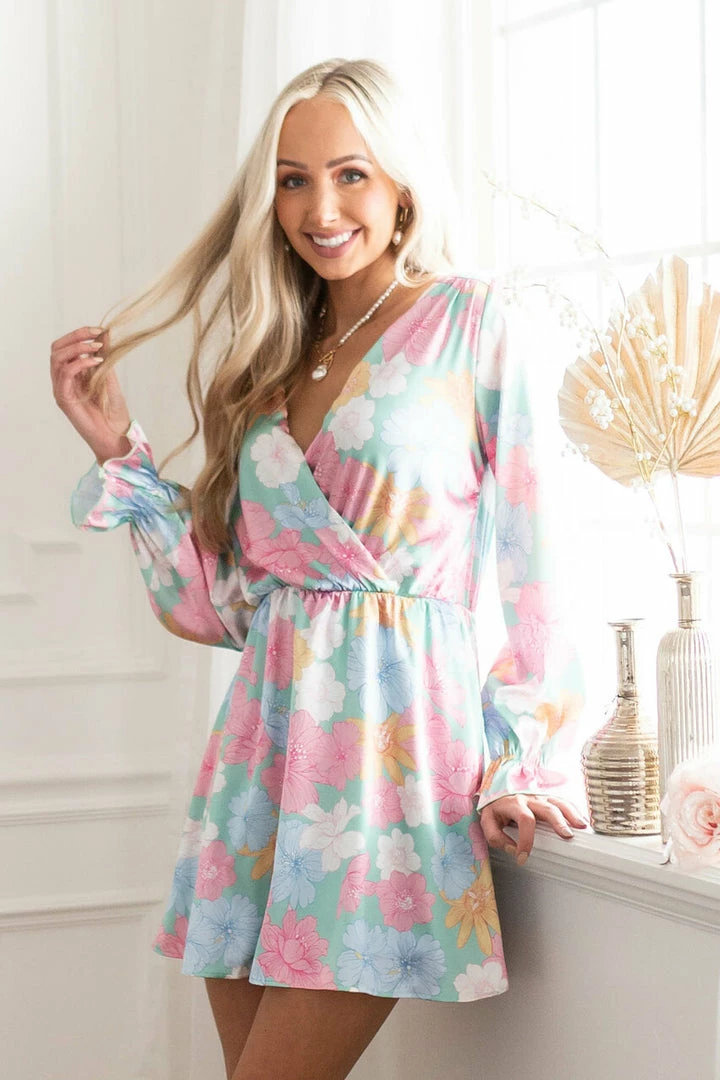 - Floral print in shades of Seafoam, Ivory, Baby Pink, Faded Magenta, Sky Blue, Dusty Blue, Amber and Sunset