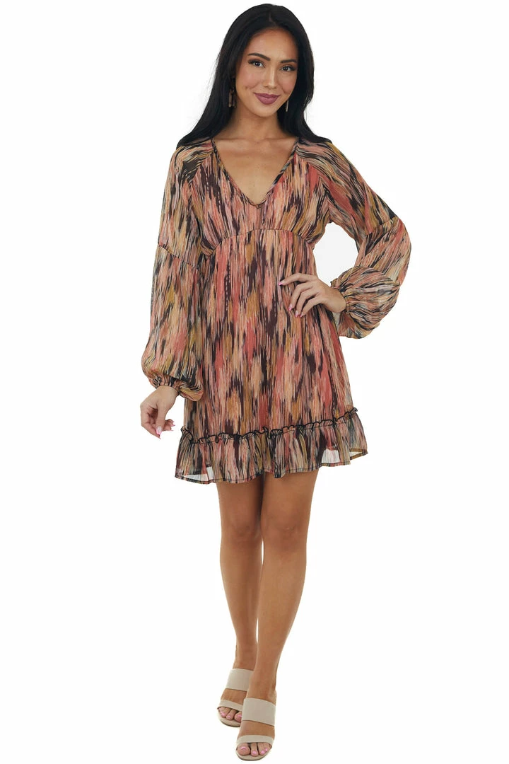- Terracotta Abstract V Neck Babydoll Mini Dress