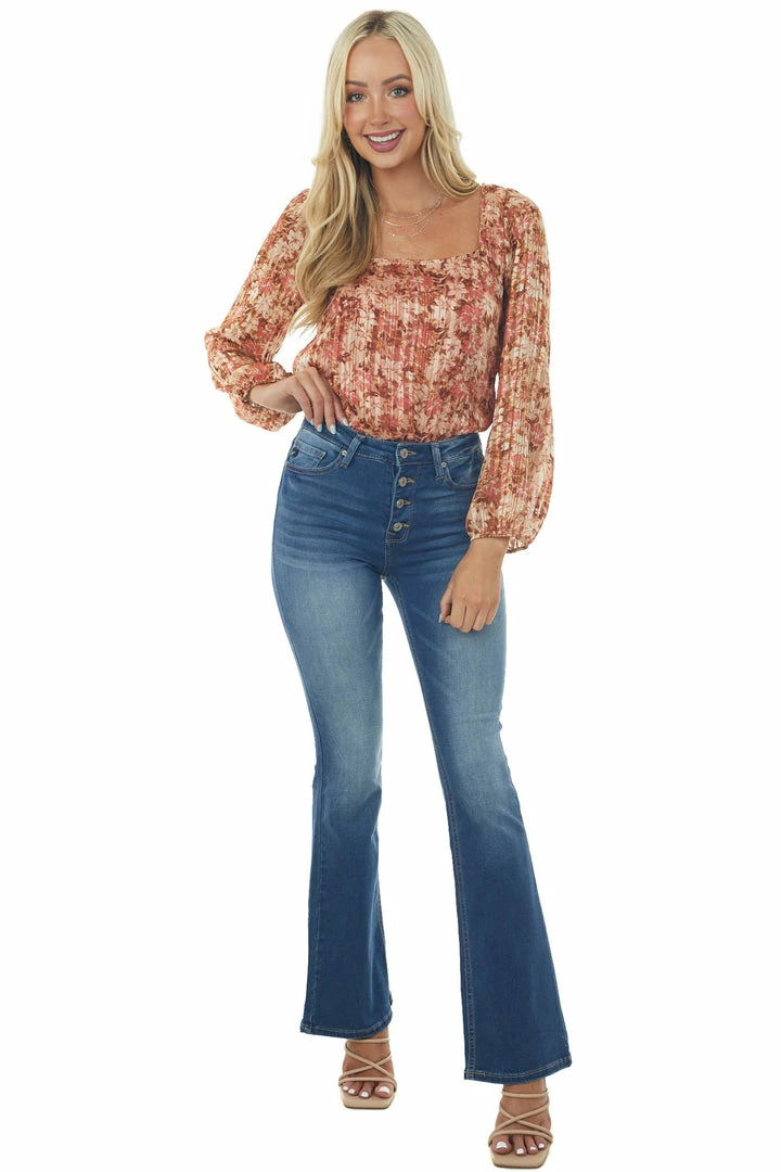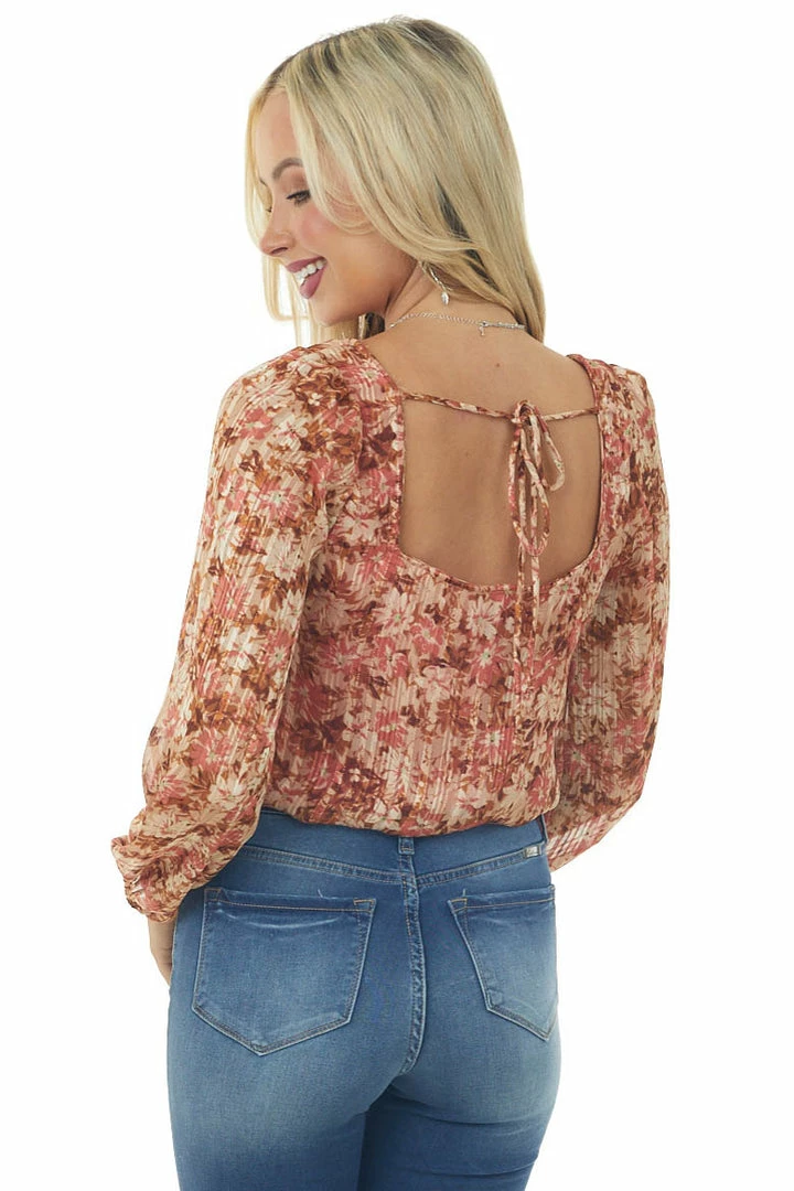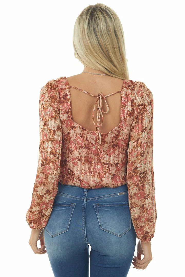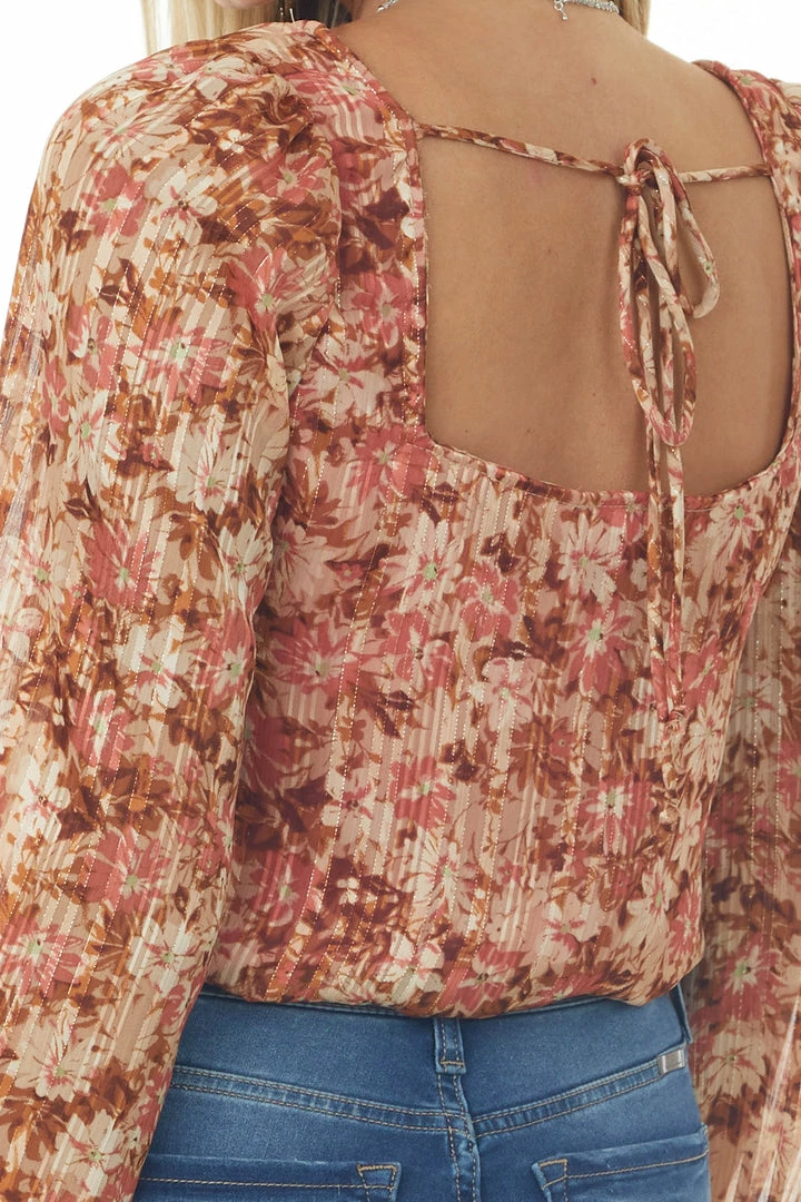 - Cream and Cognac Floral Bubble Sleeve Bodysuit