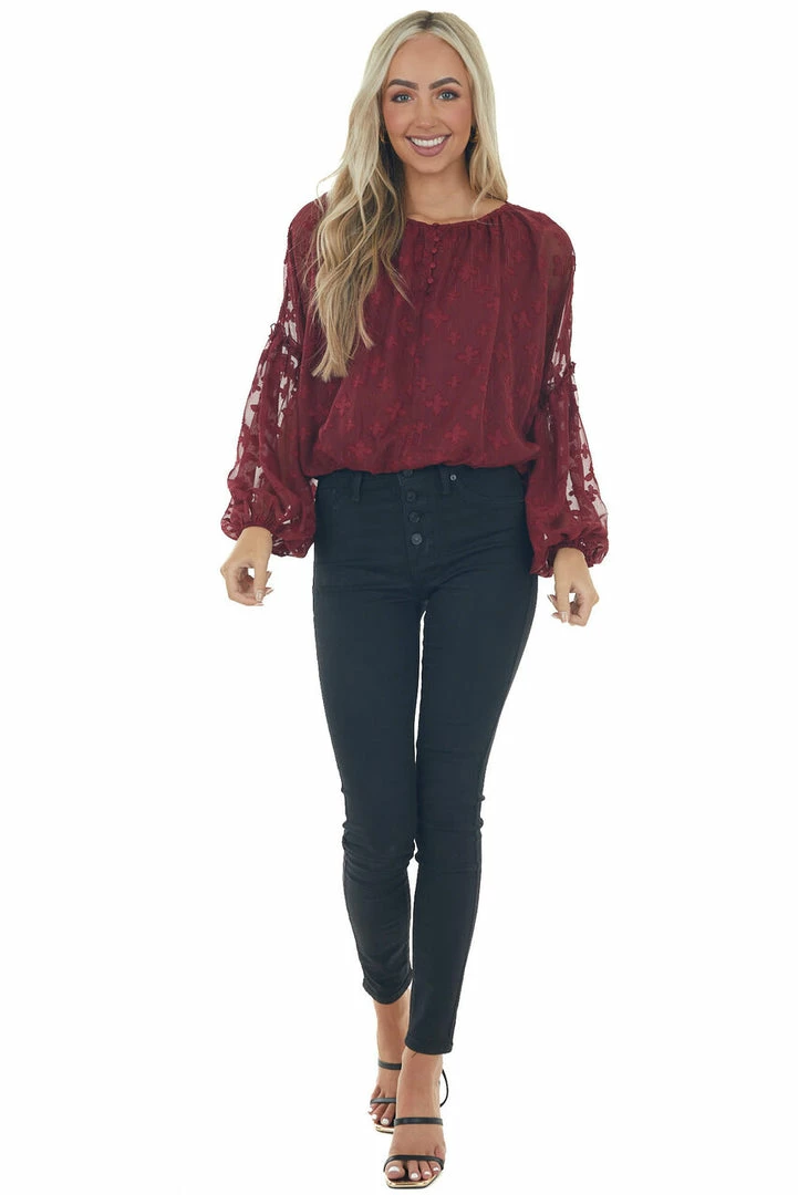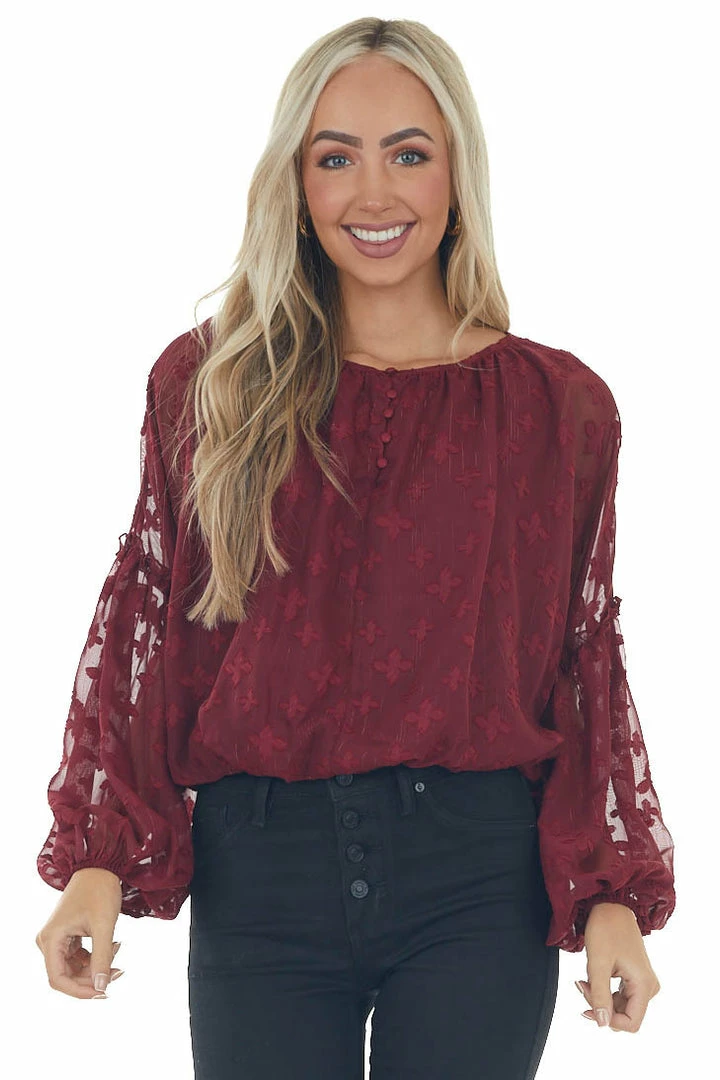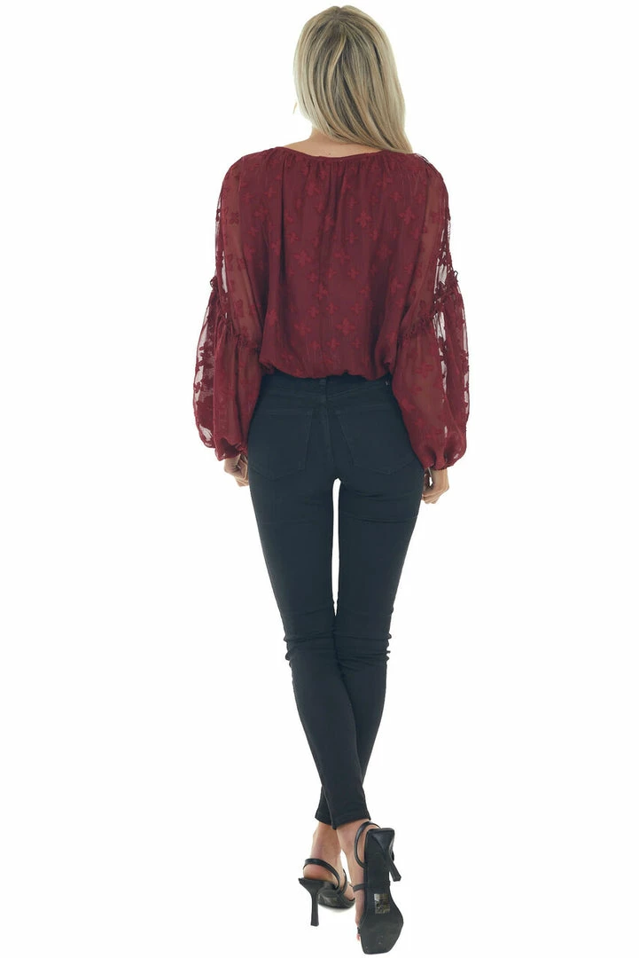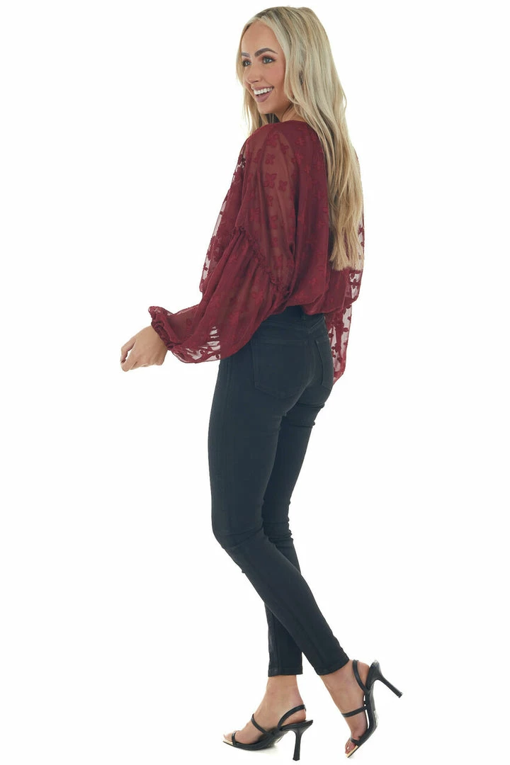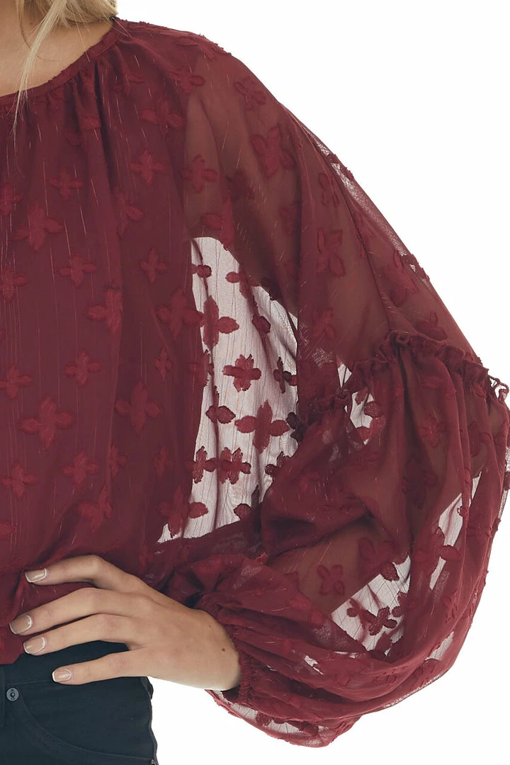 - Maroon Jacquard Bubble Sleeve Cropped Blouse