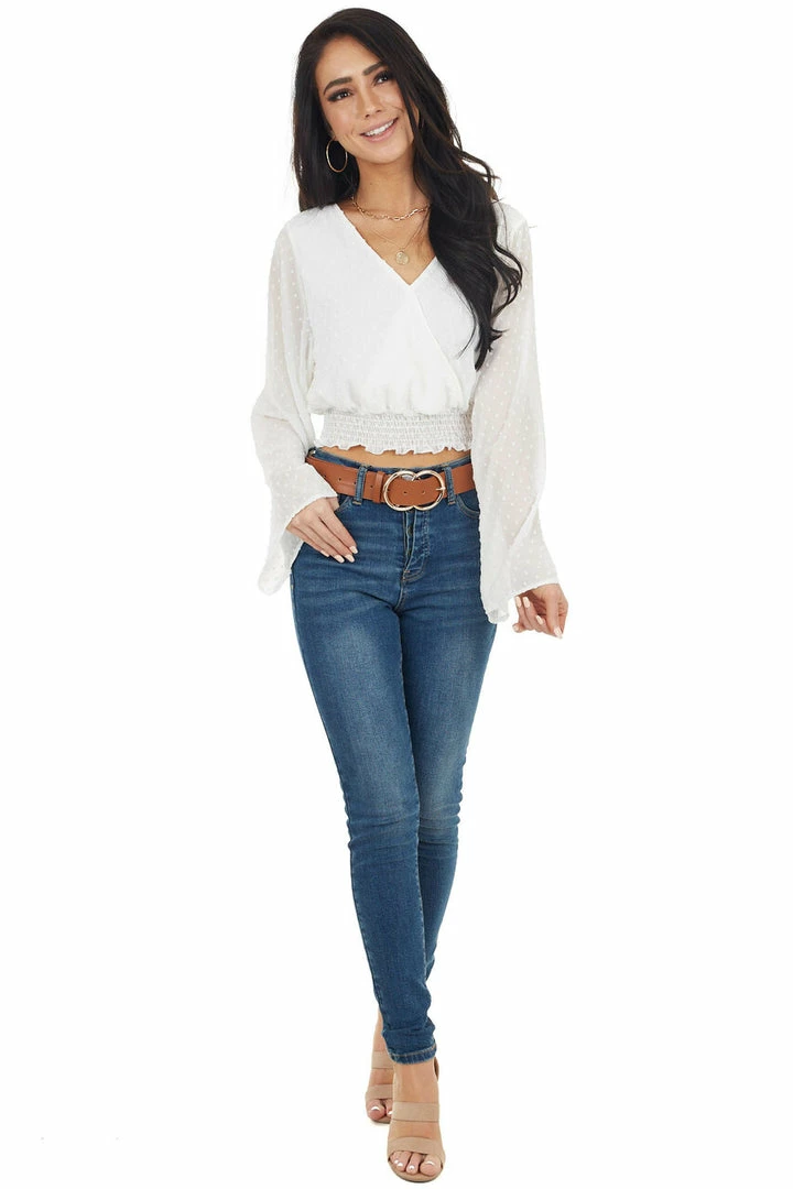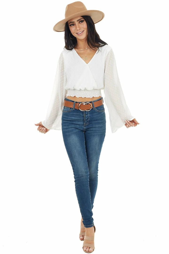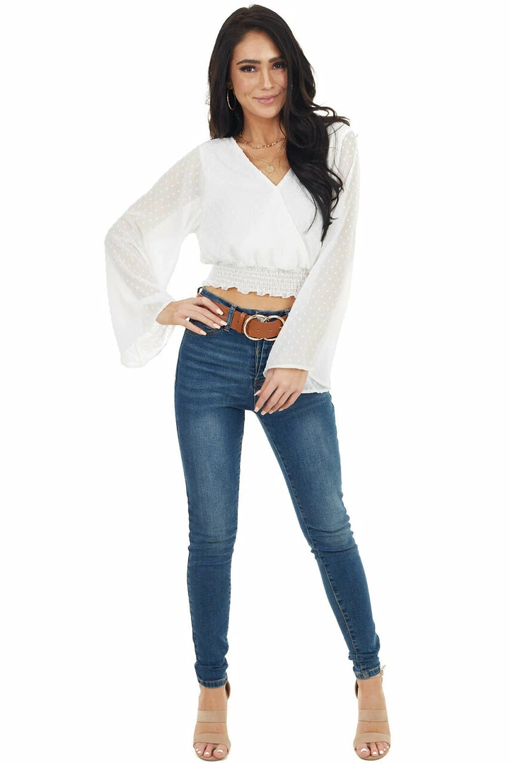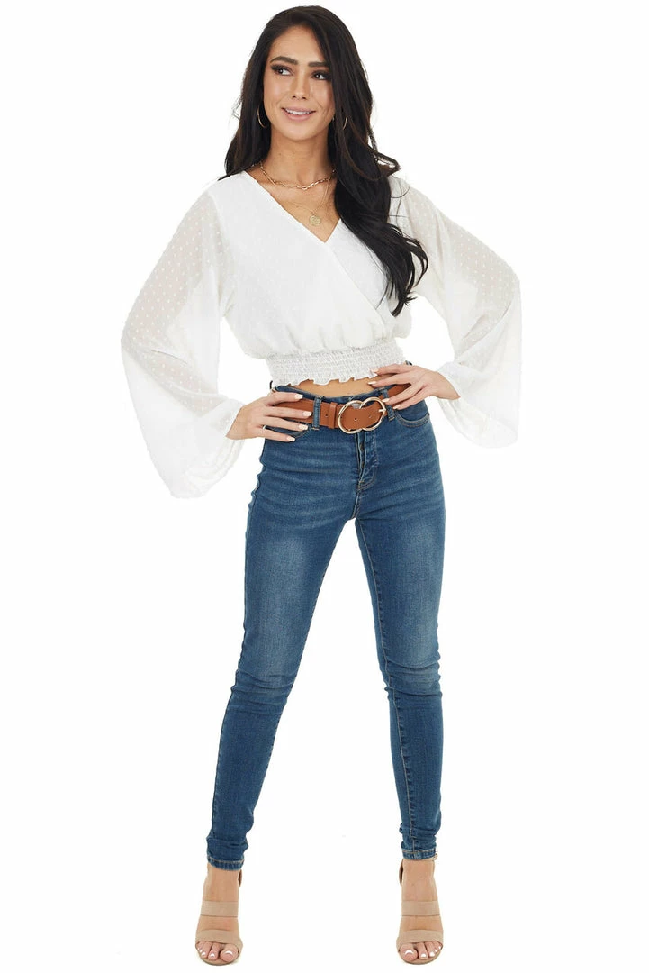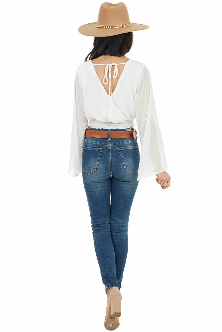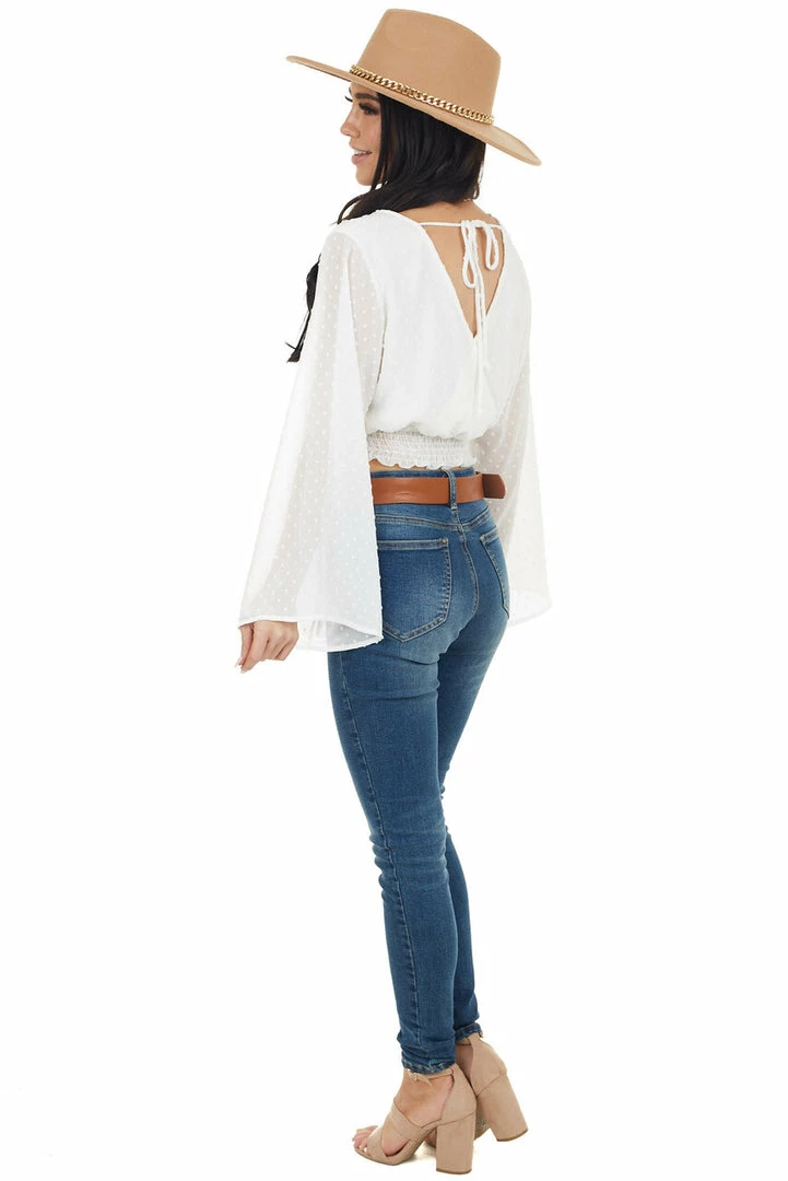 - Pearl Swiss Dot Long Kimono Sleeve Crop Top with Tie Detail