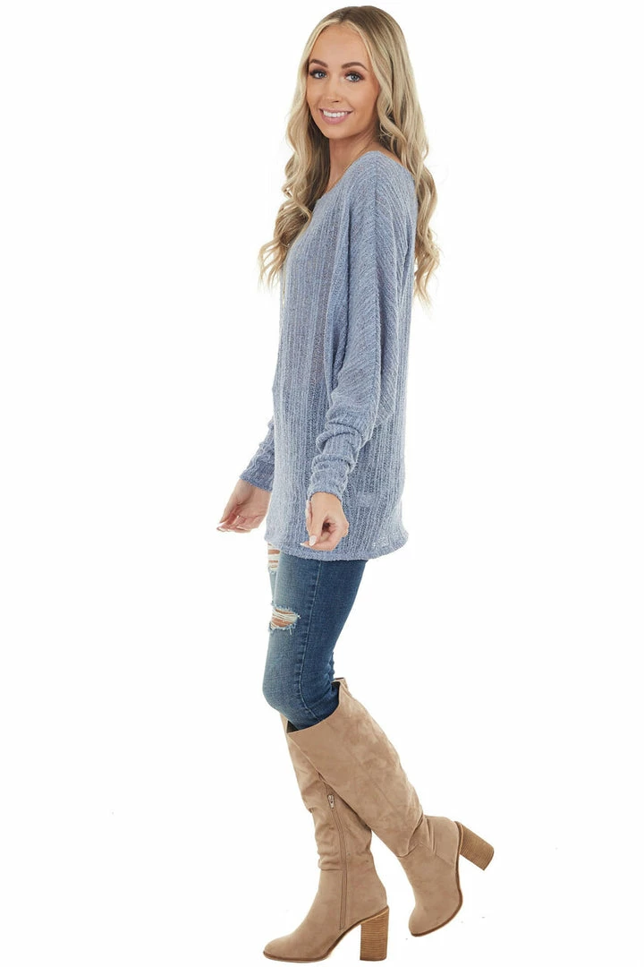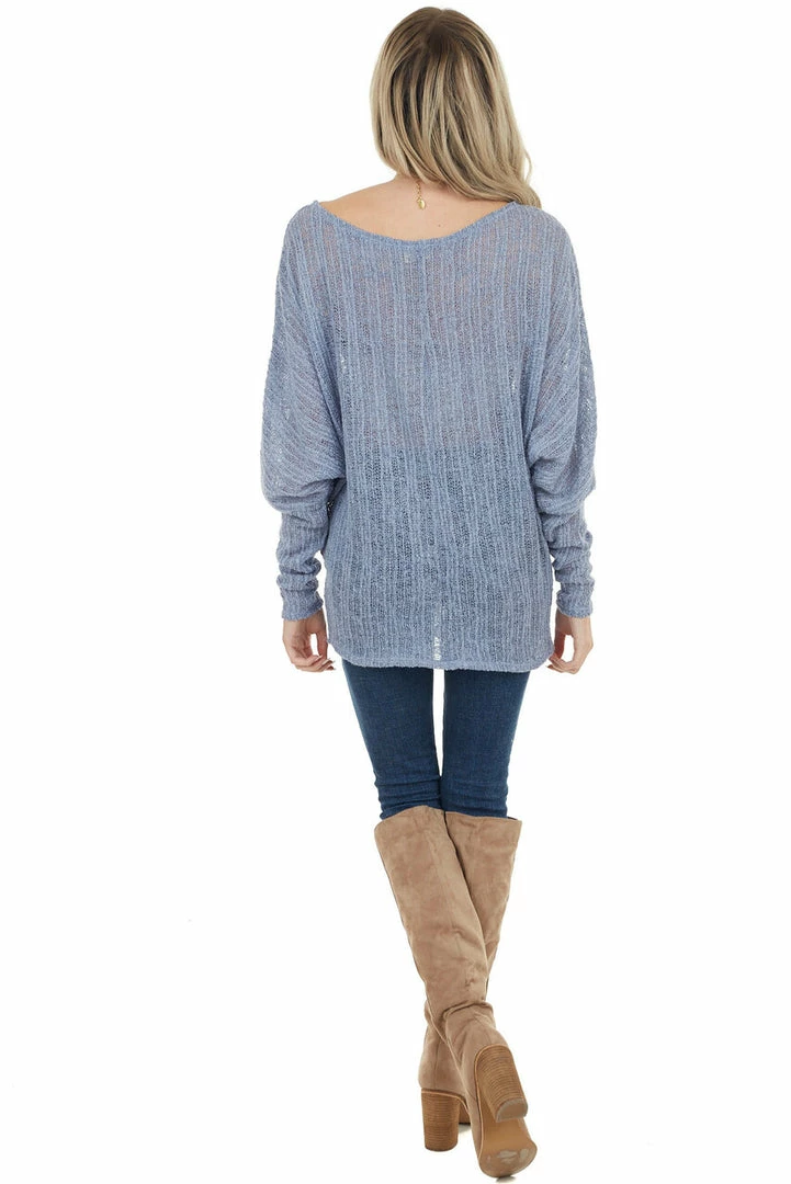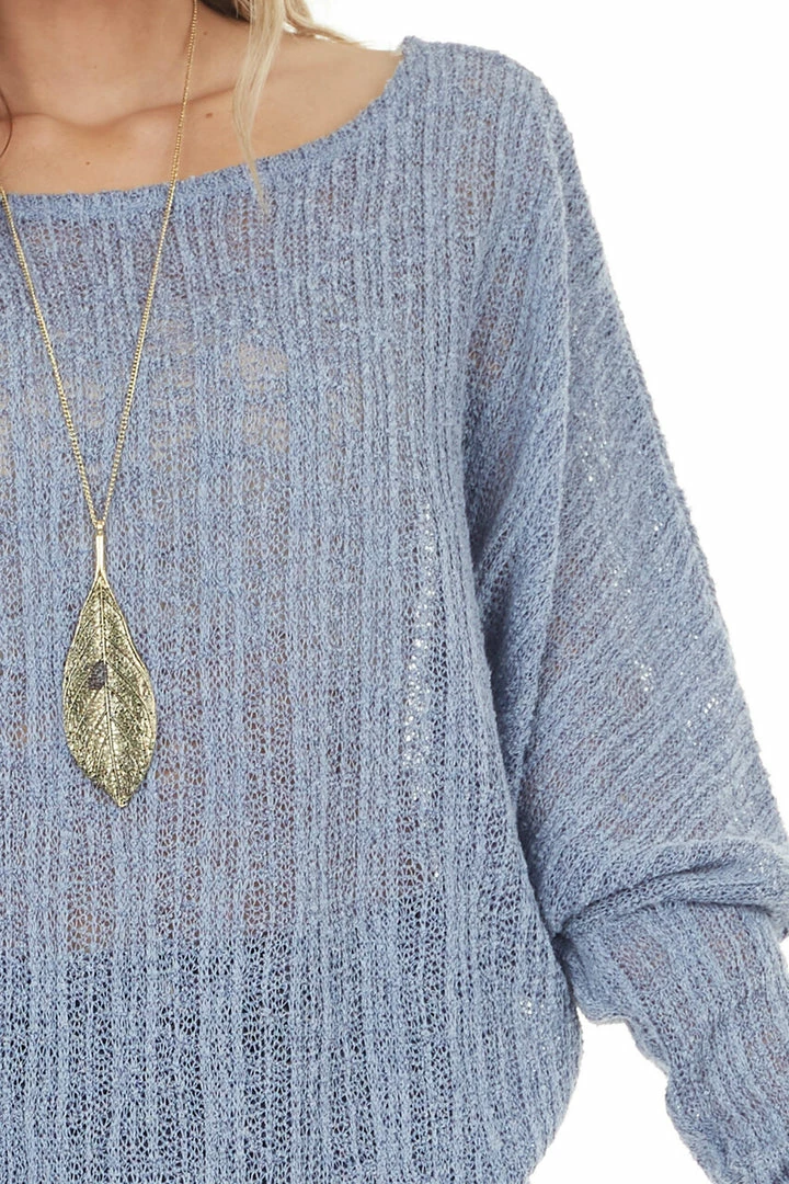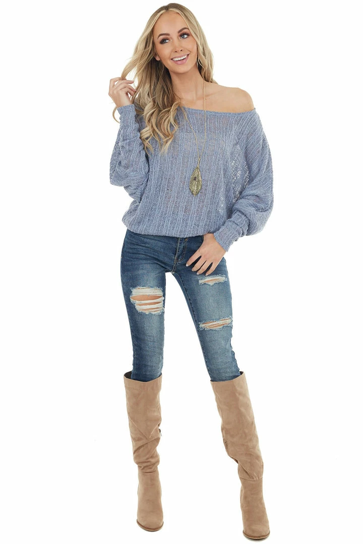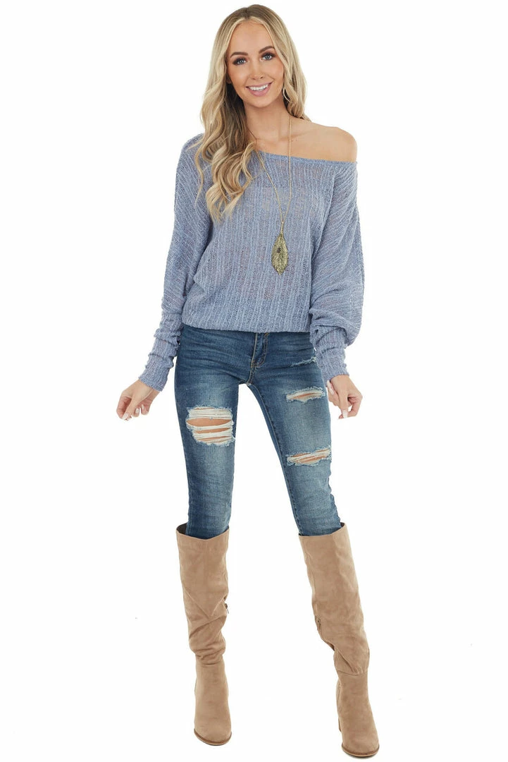 - Slate Blue Loose Knit Off Shoulder Top with Dolman Sleeves