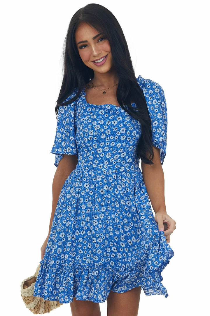 - Cobalt Floral Open Back Bell Sleeve Short Dress
