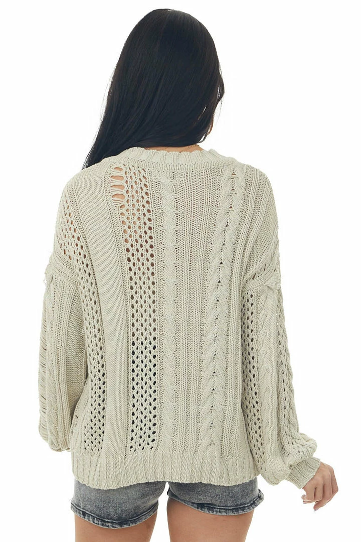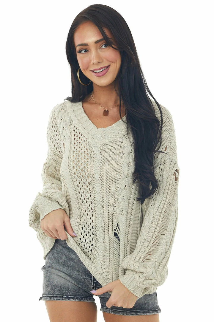- Oatmeal Distressed Cable Knit V Neck Sweater