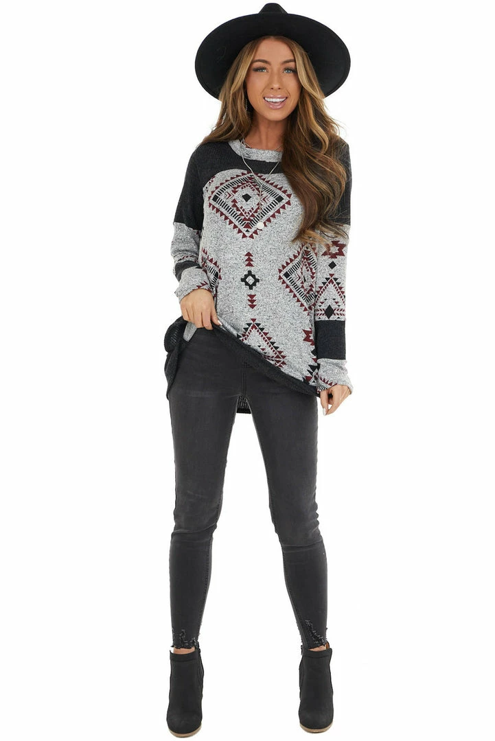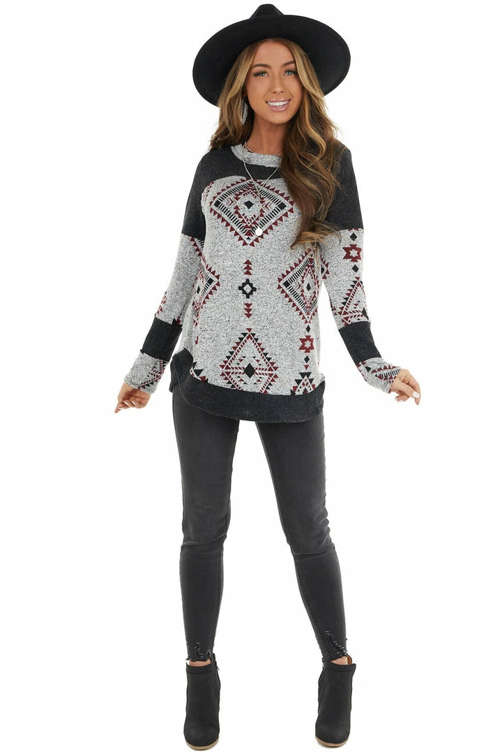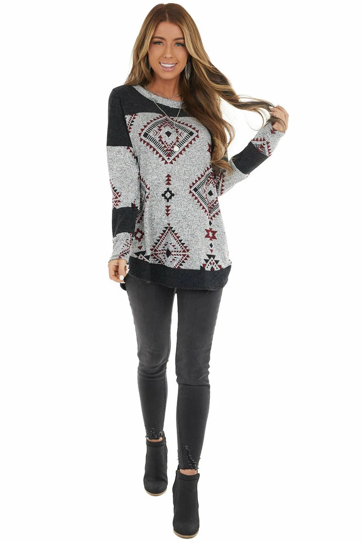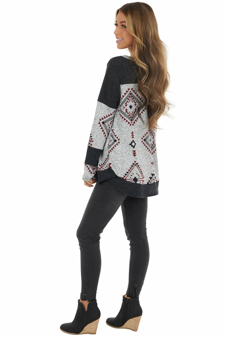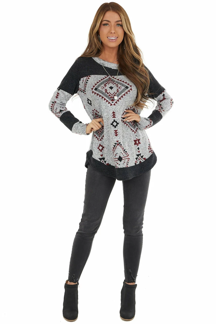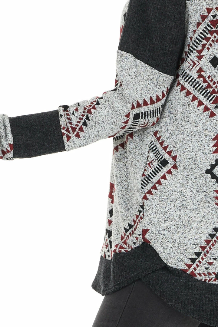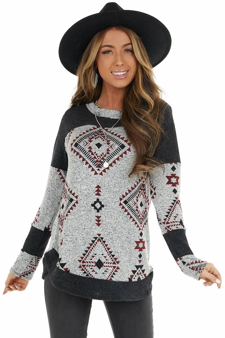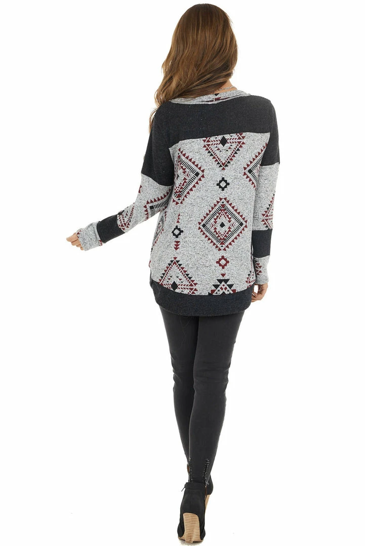 - Black Two Tone Aztec Print Knit Top with Raw Edge Details