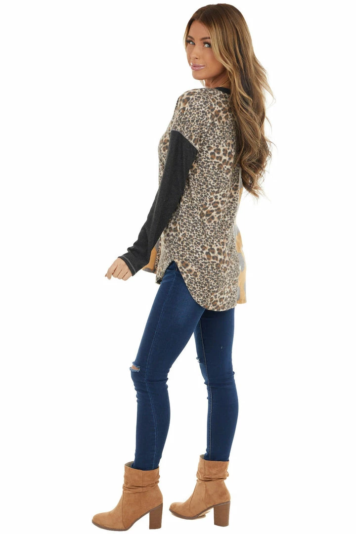 - Charcoal Multicolored Leopard Print Long Sleeve Knit Top