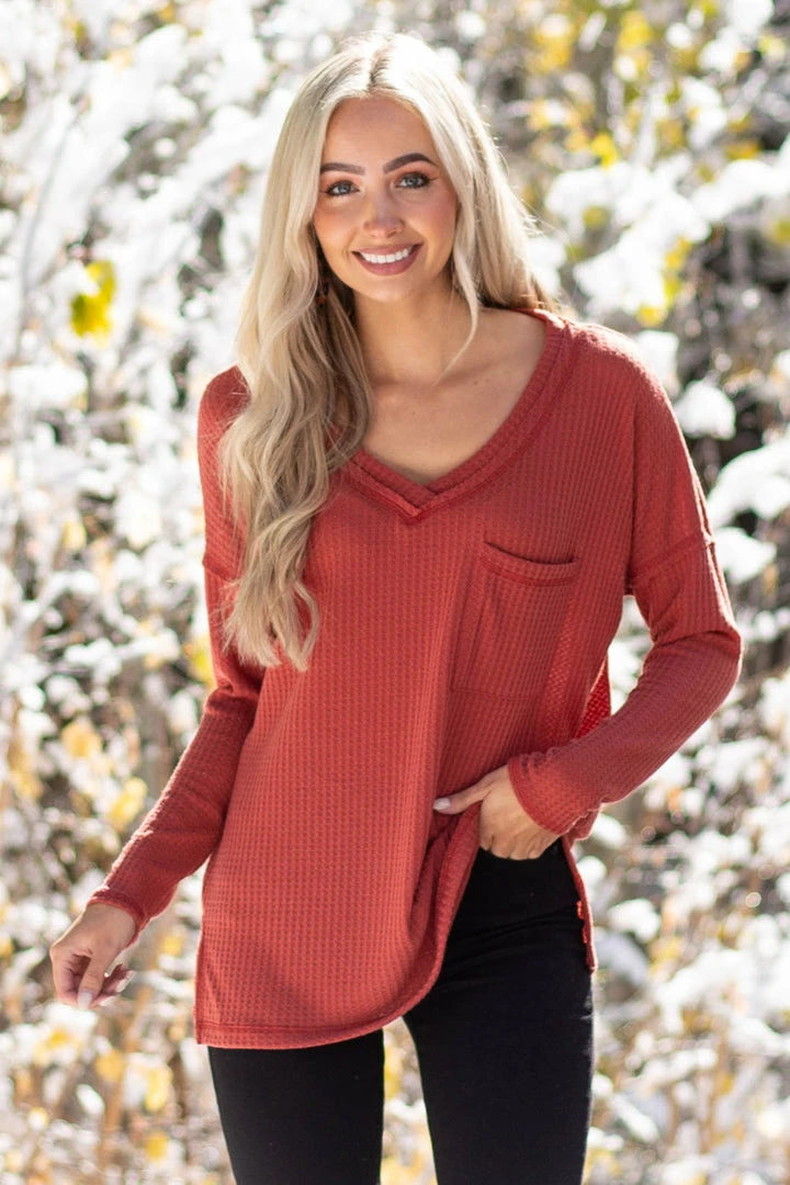 - Rust V Neck Waffle Knit Top with Chest Pocket