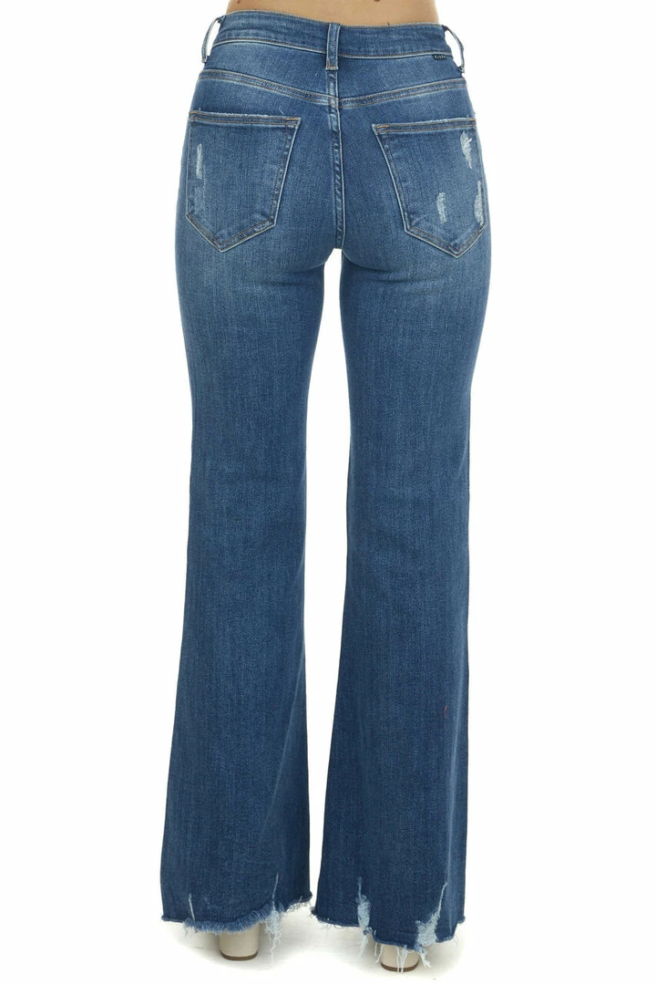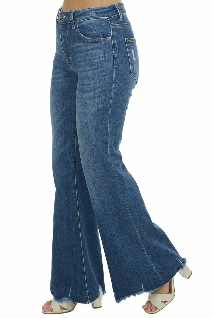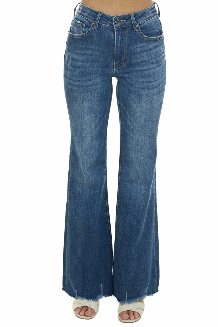 - Dark Wash High Rise Raw Hem Flare Fit Jeans