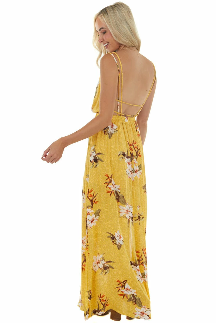 - Canary Yellow Floral and Polka Dot Print Maxi Dress