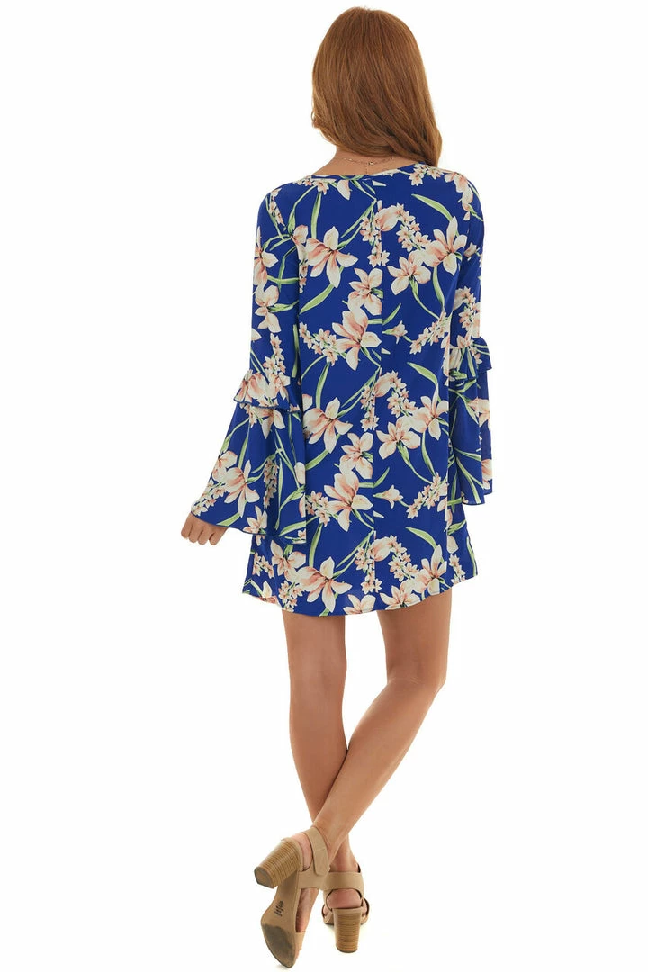 - Royal Blue Floral Long Bell Sleeve Short Dress