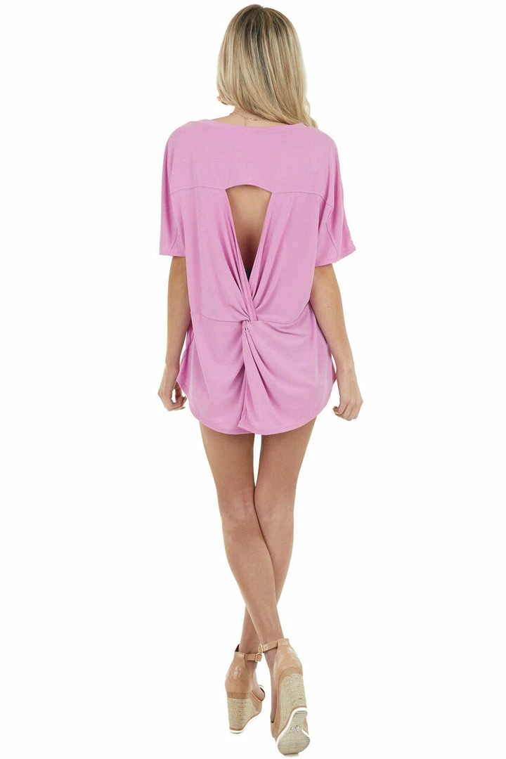 - Pink Short Sleeve Soft Knit Top with Open Back Twist