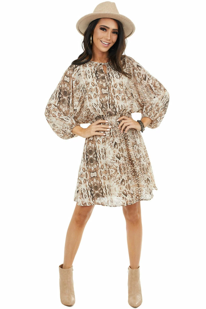 - Beige Snakeskin Print Short Dress with Smocked Waist
