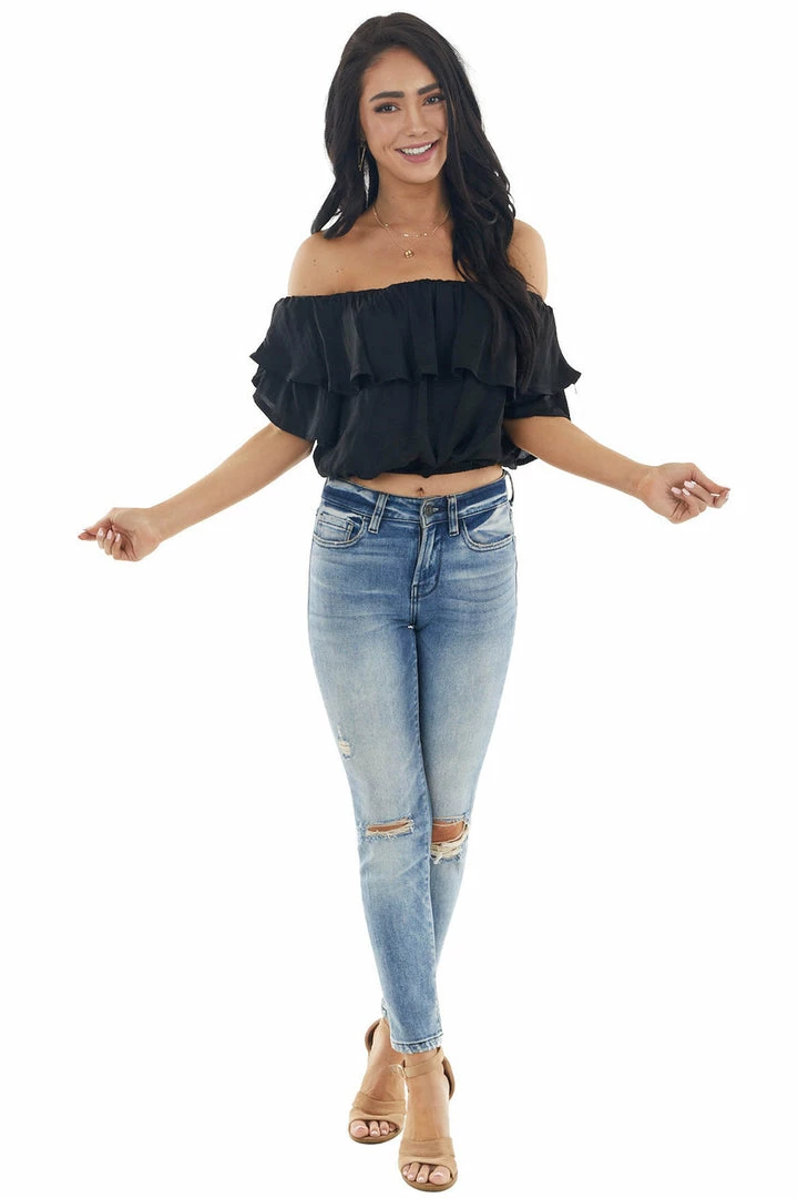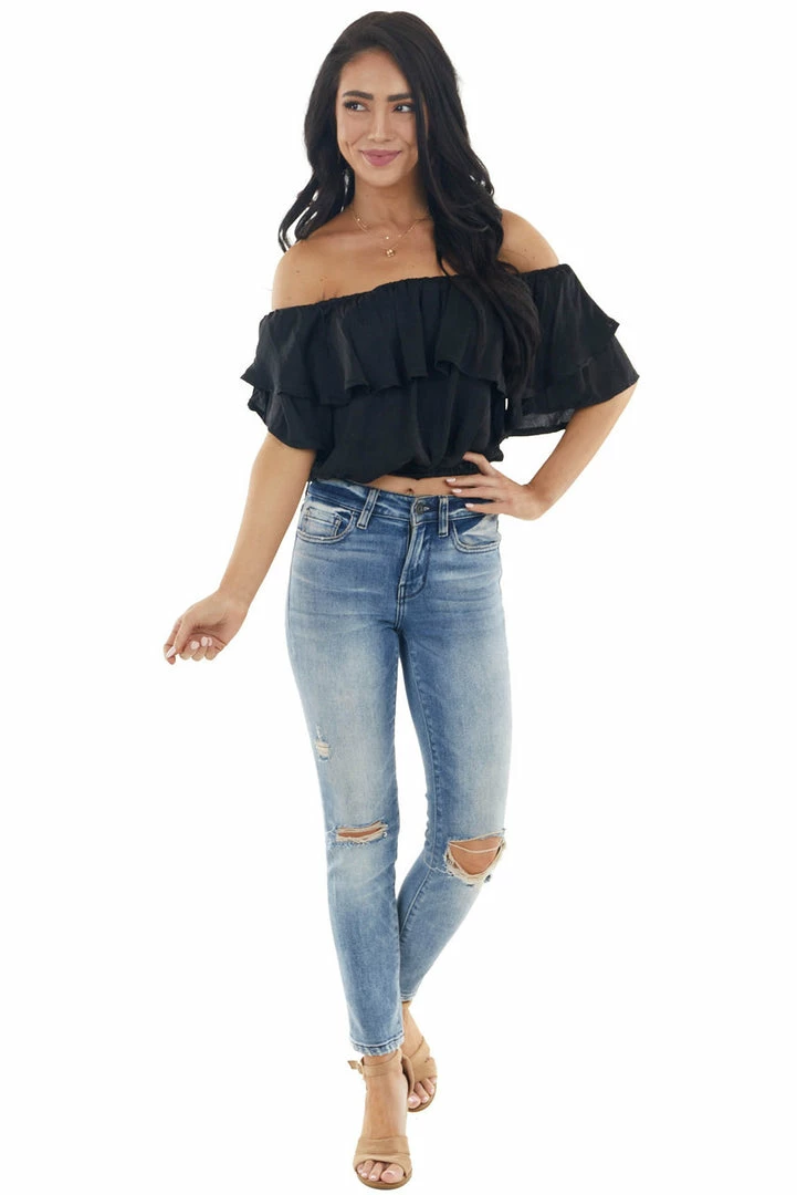 - Black Off the Shoulder Short Sleeve Overlaying Crop Top