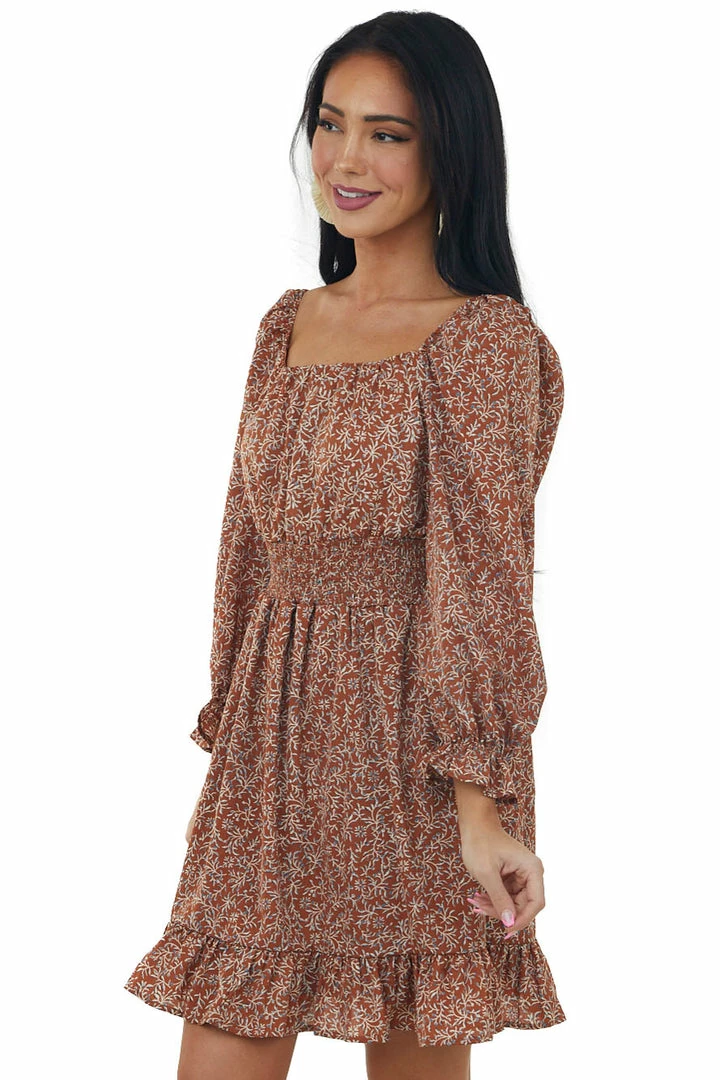 - Caramel Printed Long Bubble Sleeve Short Dress