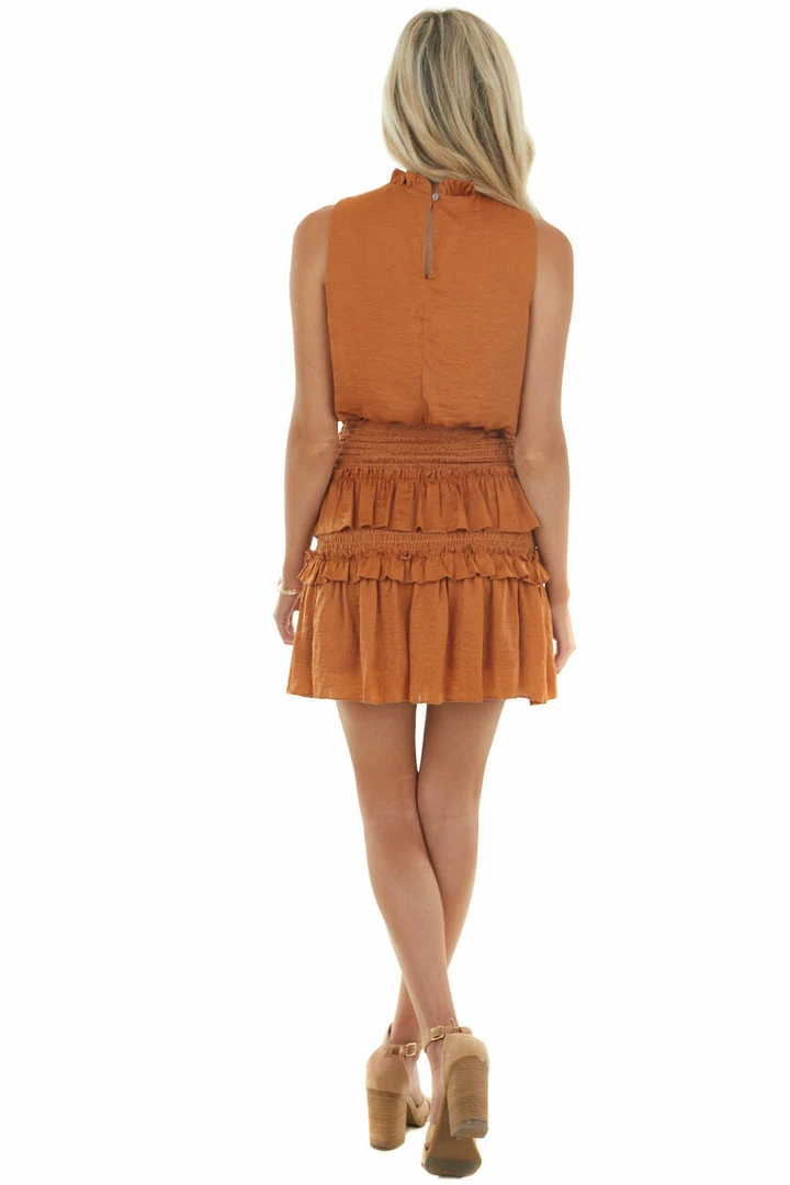 - Caramel Sleeveless Blouson Dress with Smocking and Ruffles