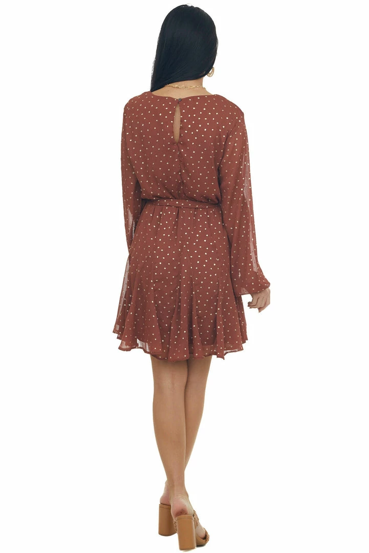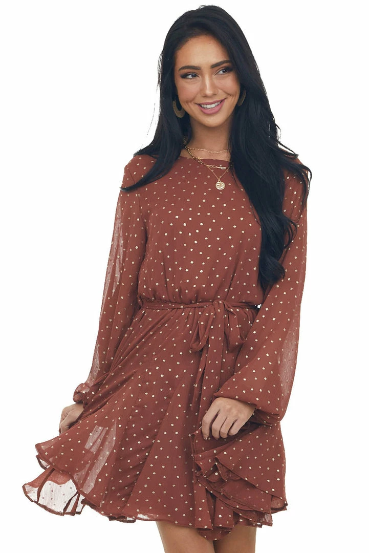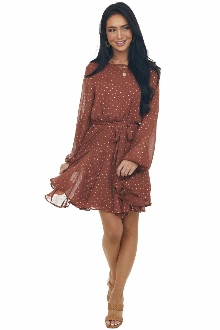 - Cinnamon Drop Waist Short Dress with Gold Dots