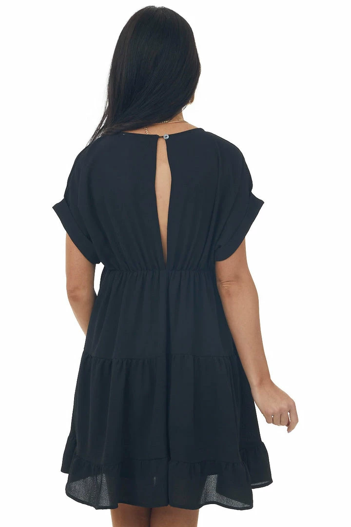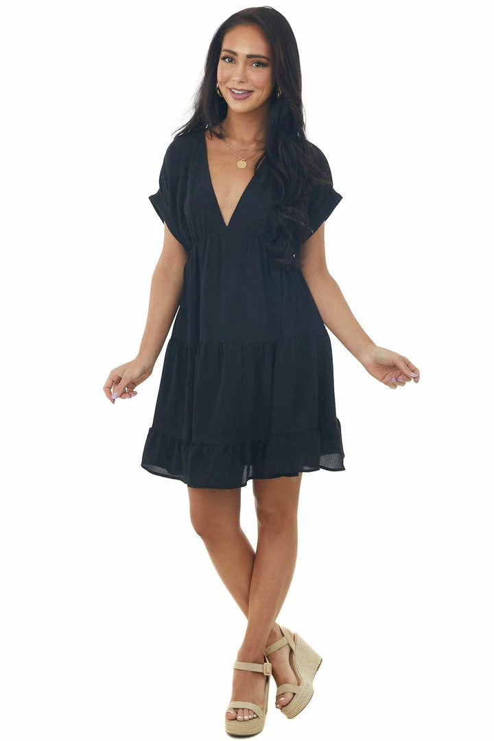 - Black Plunging Neck Cuffed Sleeve Tiered Dress