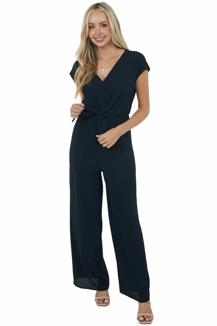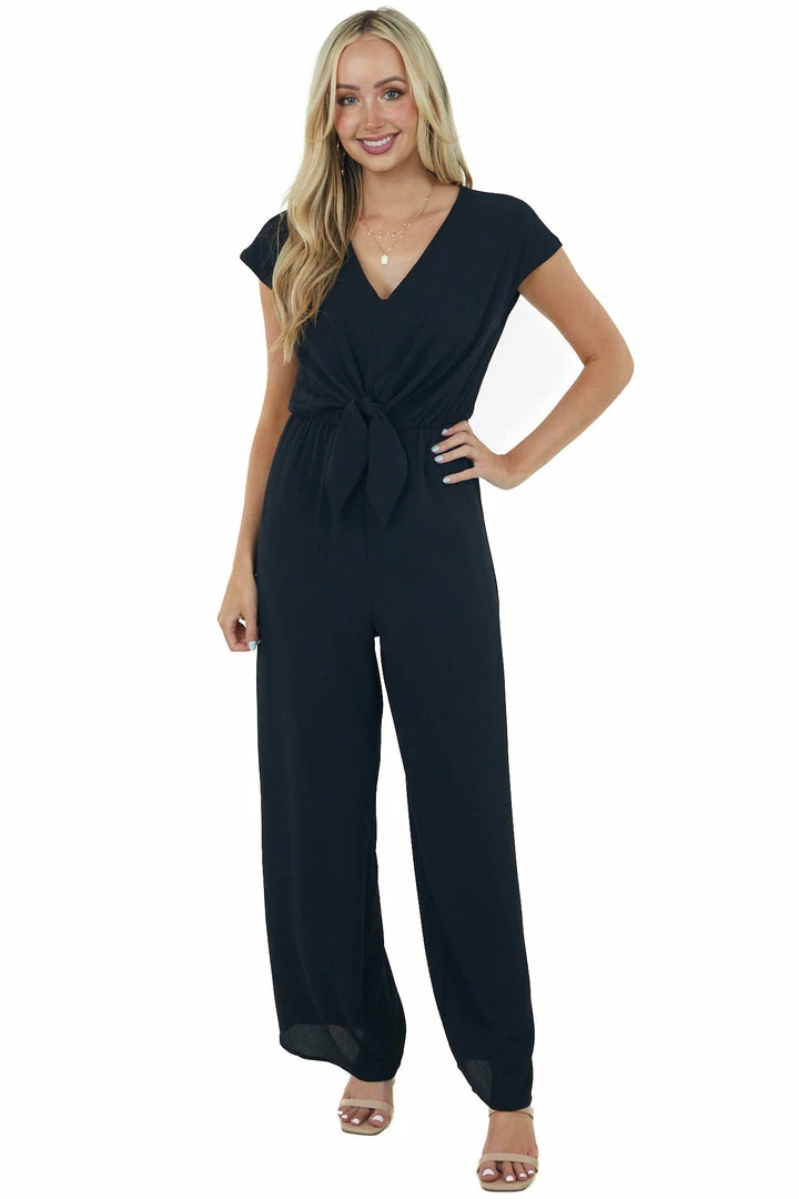 - Black V Neck Woven Jumpsuit with Front Tie Detail