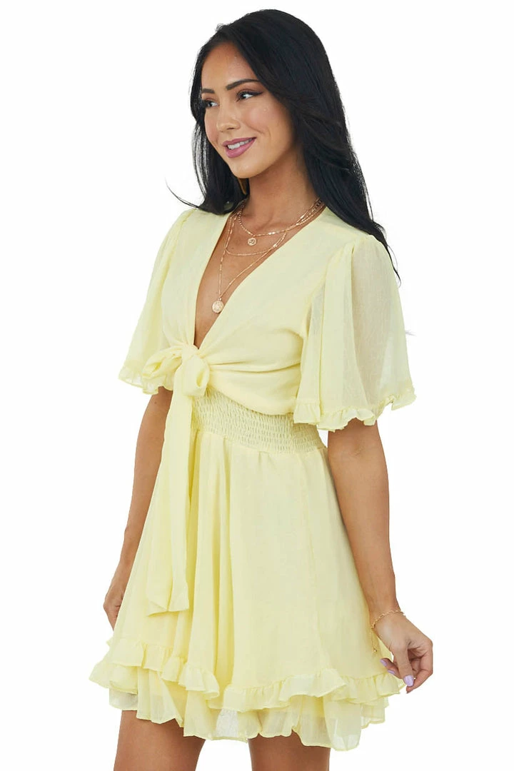 - Light Yellow Ruffle Trim Front Tie Smocked Dress