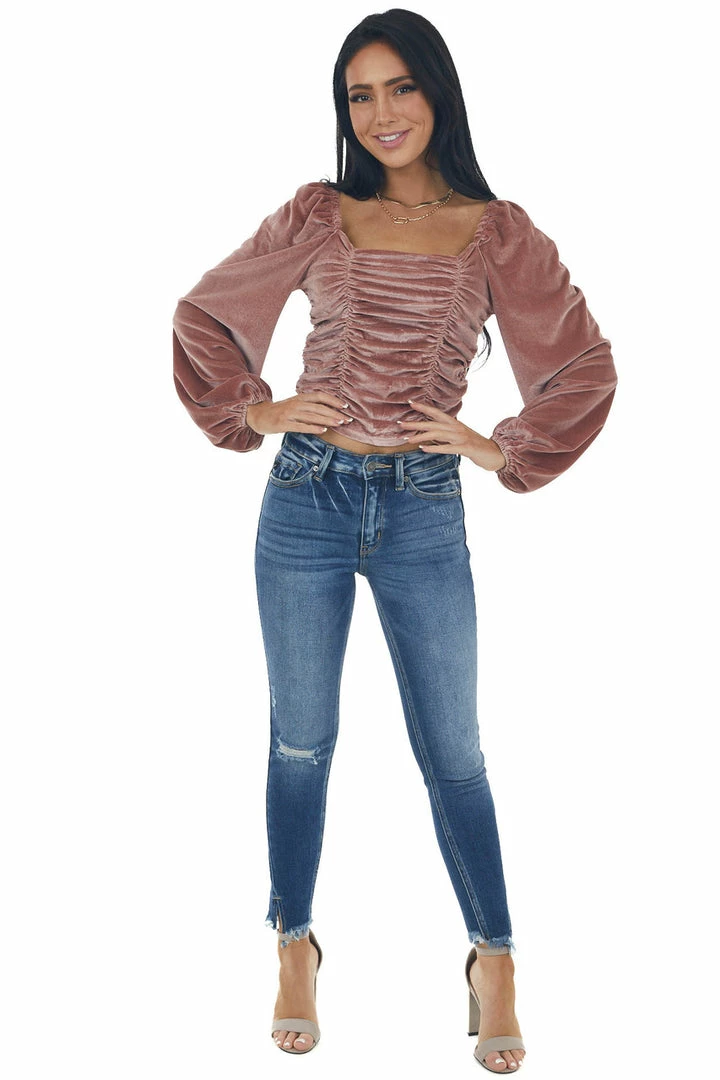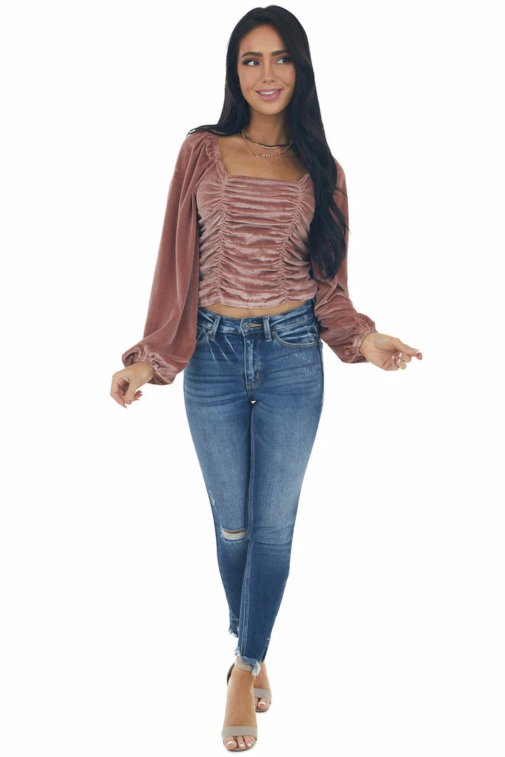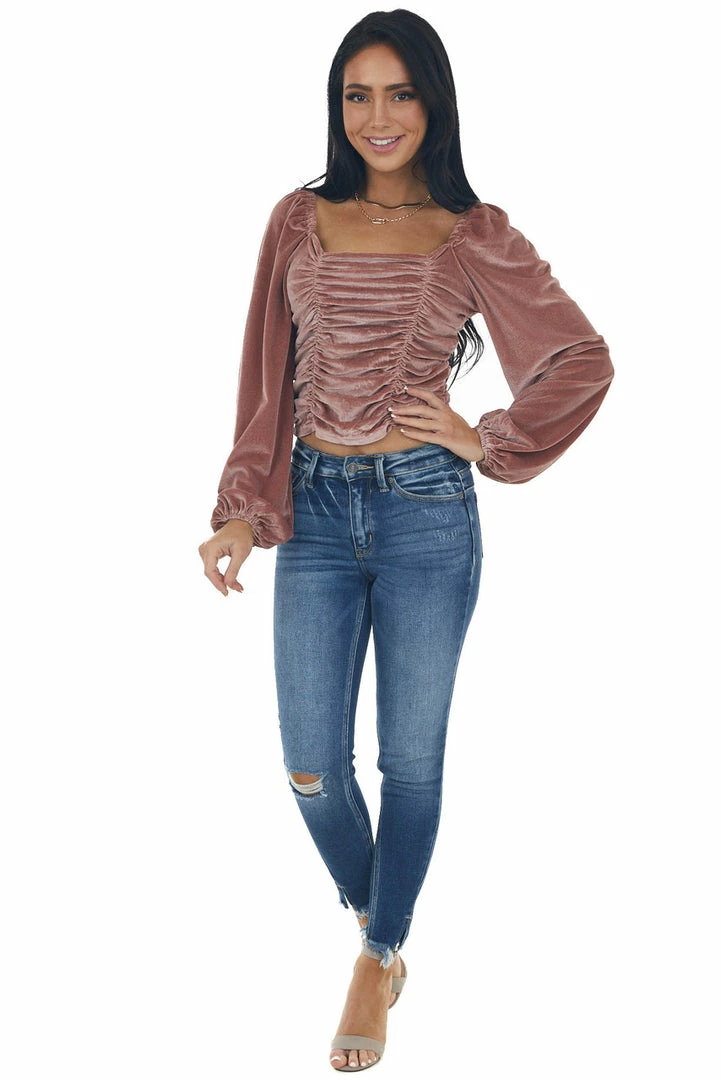 - Dusty Rose Long Puff Sleeve Ruched Velvet Top