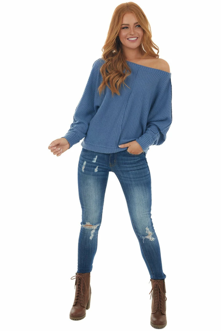 - Hazy Blue Dolman Sleeve Fleece Waffle Knit Top