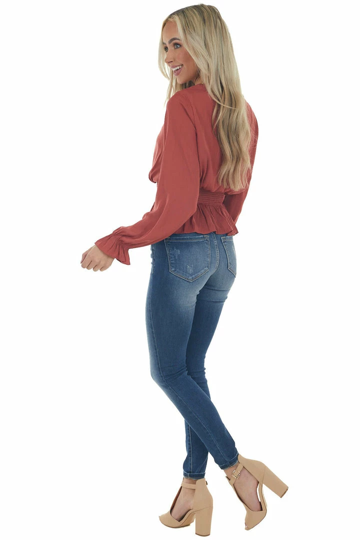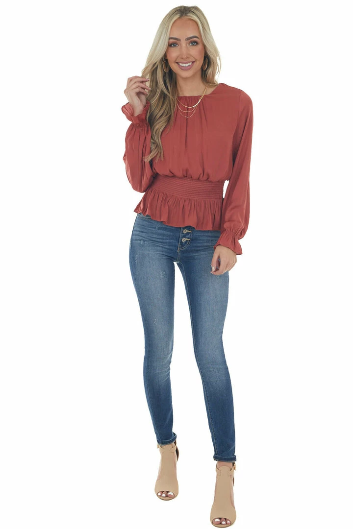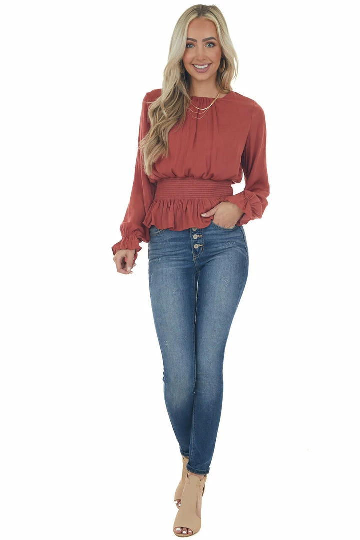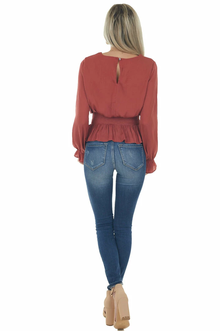 - Marsala Smocked Waist Bubble Sleeve Peplum Top