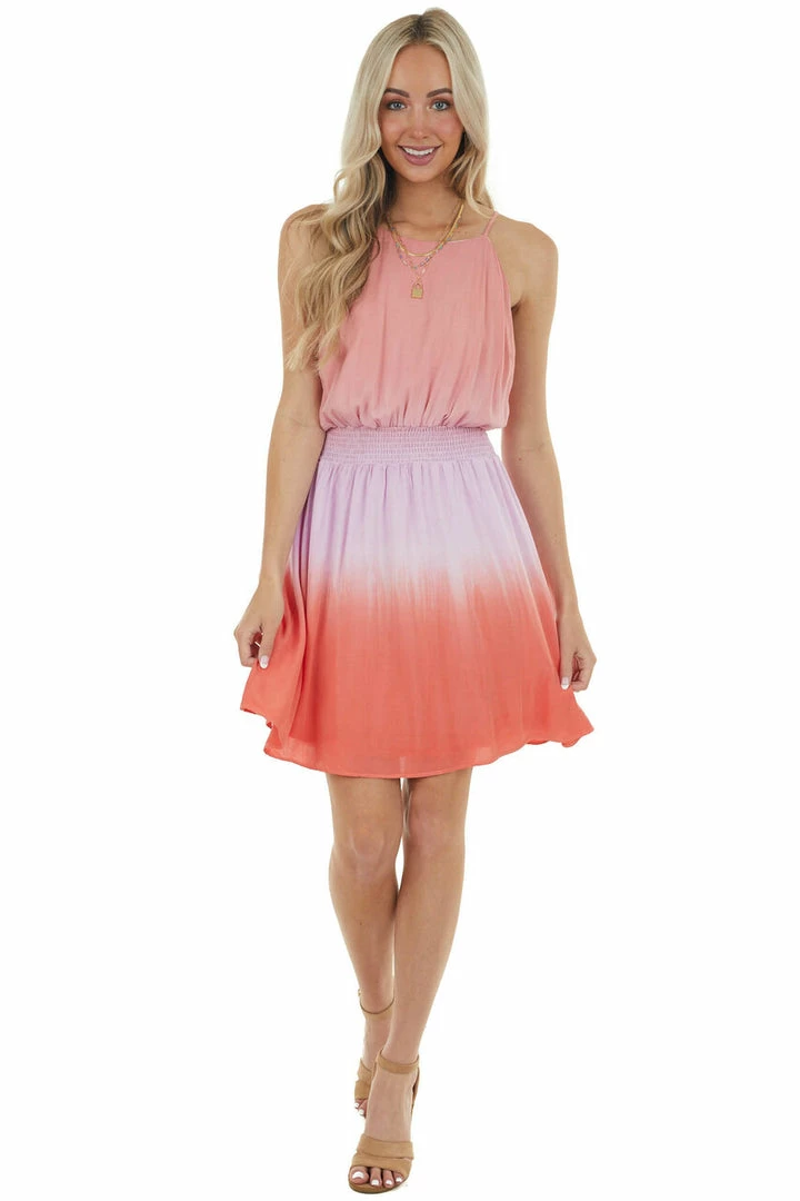 - Peach Ombre Dye Sleeveless Halter Neck Dress