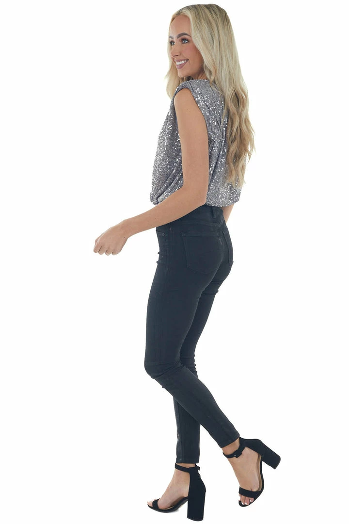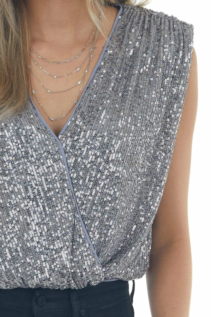 - Slate Sequined Surplice Shoulder Pad Bodysuit