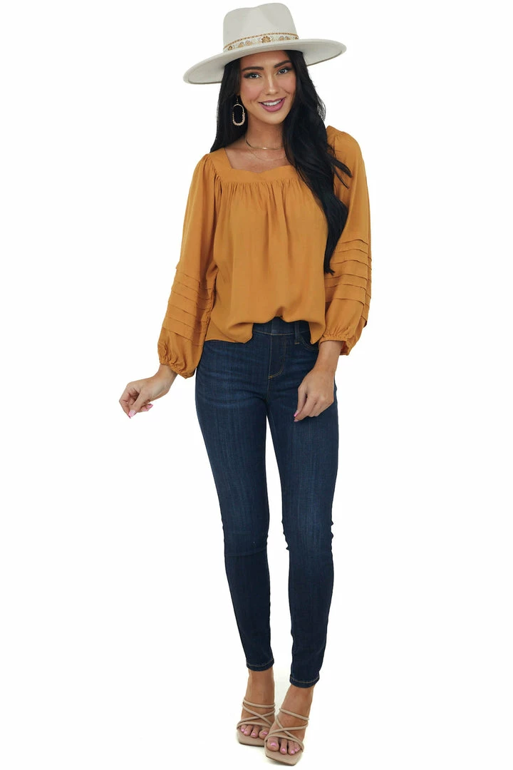 - Mustard Square Neck Pleated Puff Sleeve Blouse