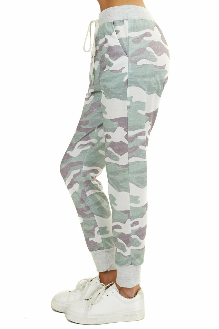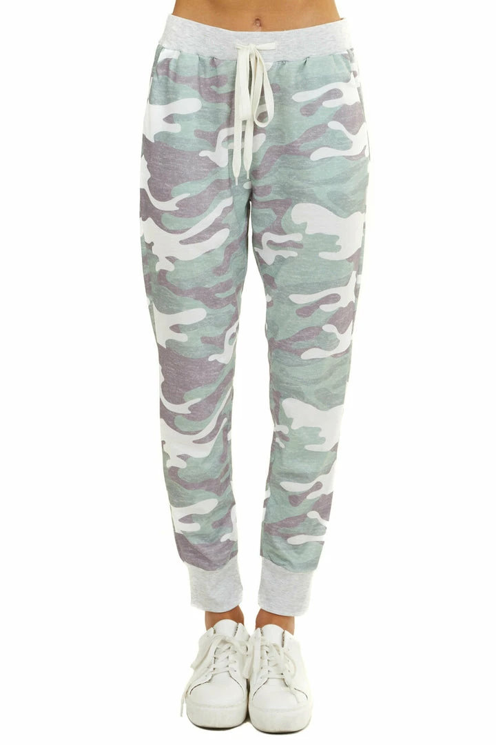 - Sage Green Camo Print Joggers with Drawstrings and Pockets