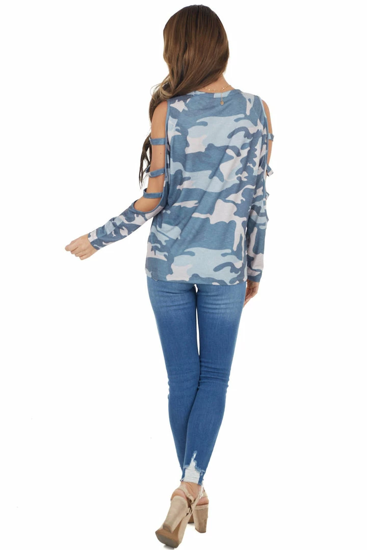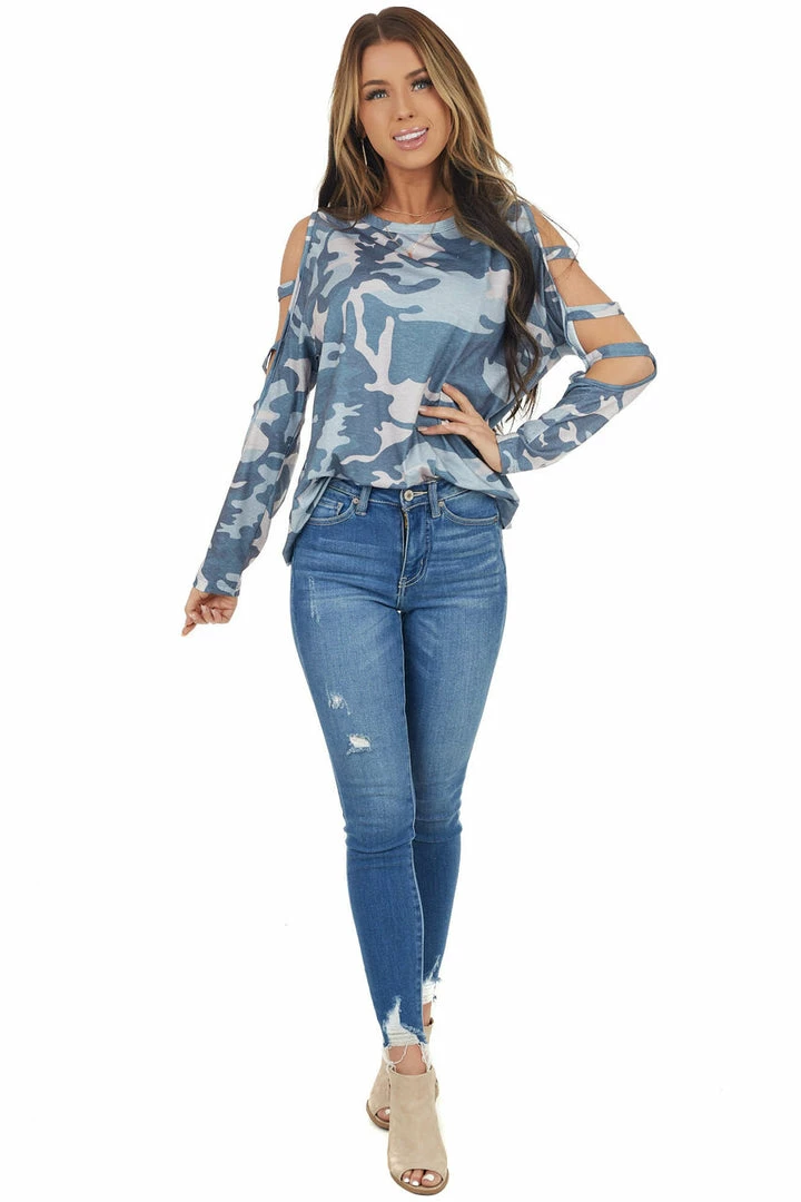 - Navy Camo Long Ladder Sleeve Stretchy Knit Top