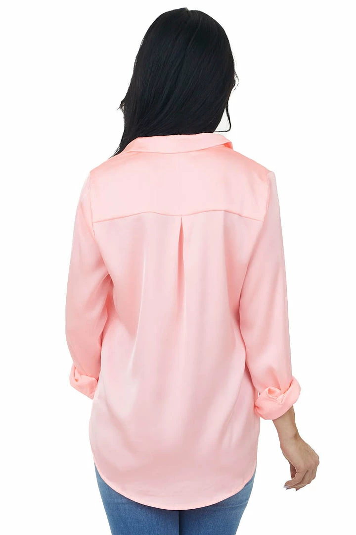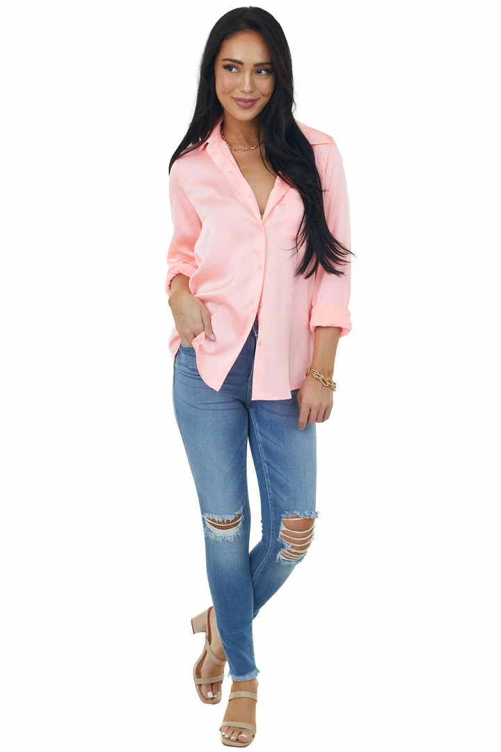 - Neon Coral Long Sleeve Button Down Satin Blouse
