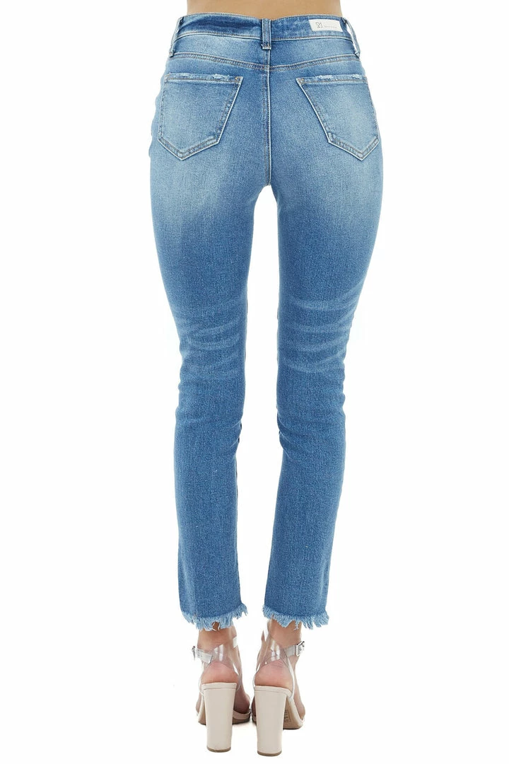 - Medium Wash High Rise Skinny Jeans with Distressed Hem