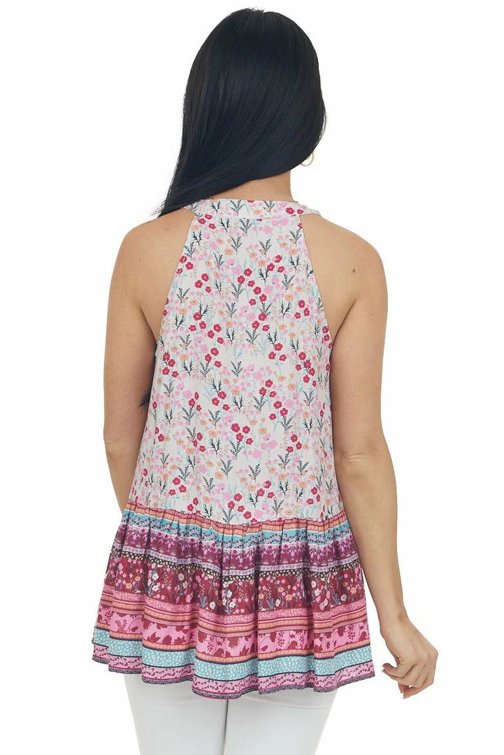 - Bubblegum Floral Print Notch Neck Halter Tank