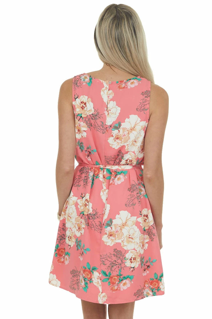 - Coral Floral Print Short Dress with Waist Tie