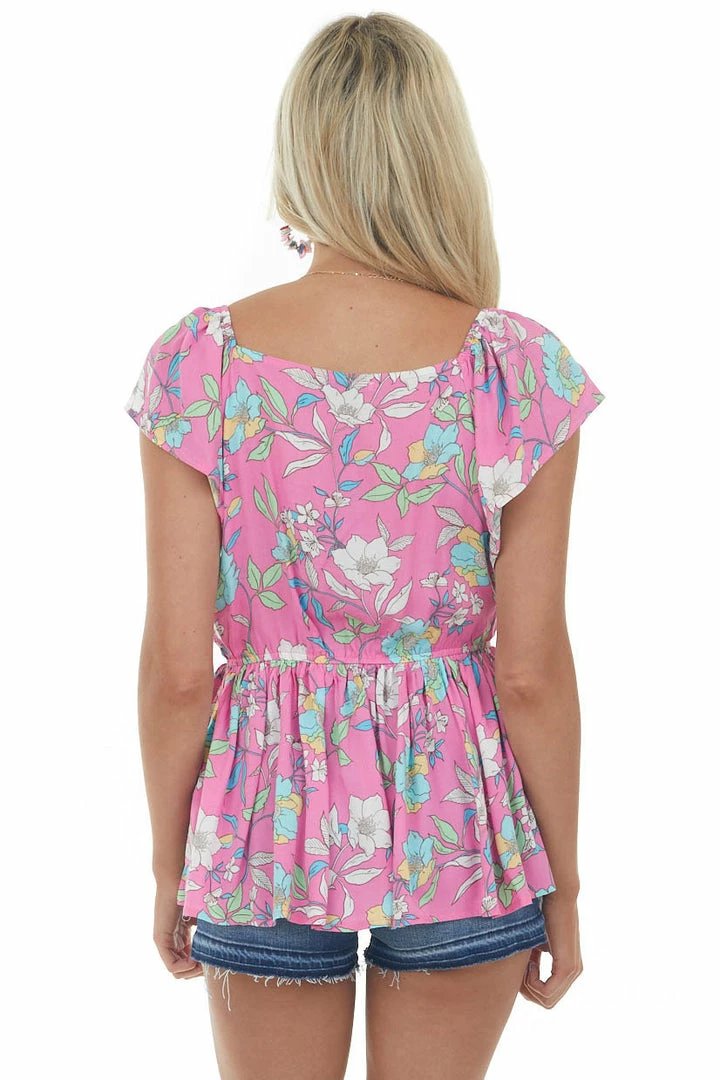 - Magenta Floral Print V Neck Peplum Blouse
