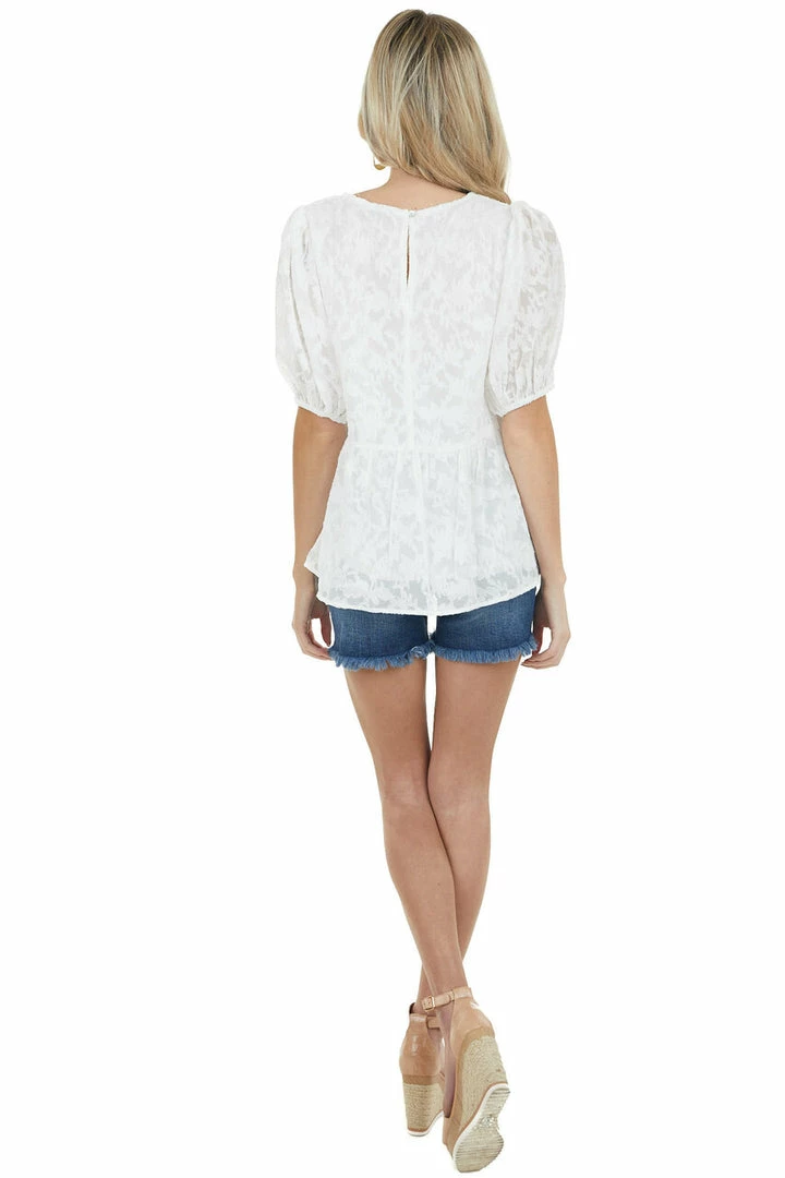 - Off White Floral Lace Peplum Top with Short Puff Sleeves