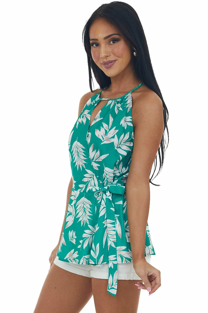 - Jade Leaf Print Surplice Keyhole Peplum Top
