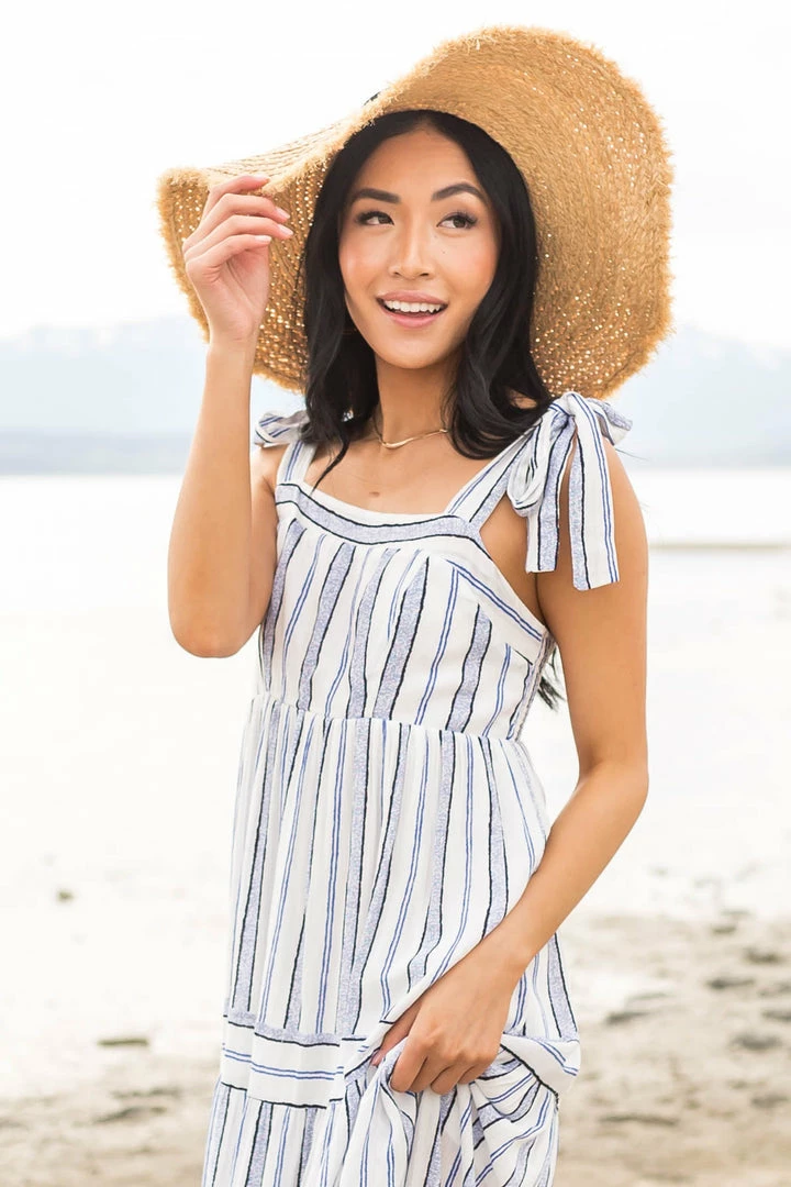 - White and Royal Blue Striped Tiered Maxi Dress