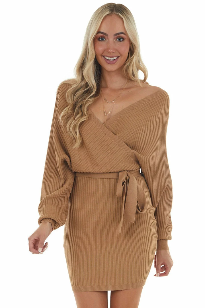 - Brown Sugar Surplice Ribbed Knit Sweater Dress