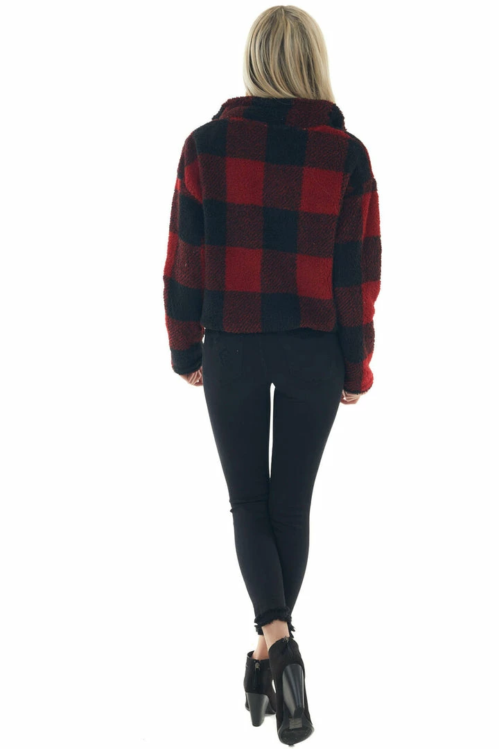 - Cranberry Buffalo Plaid Sherpa Pullover Jacket