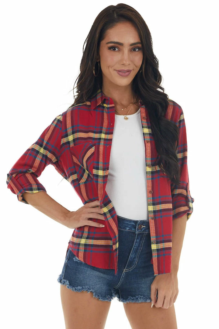 - Plaid in shades of Cranberry, Lemon, Cobalt, Black and White