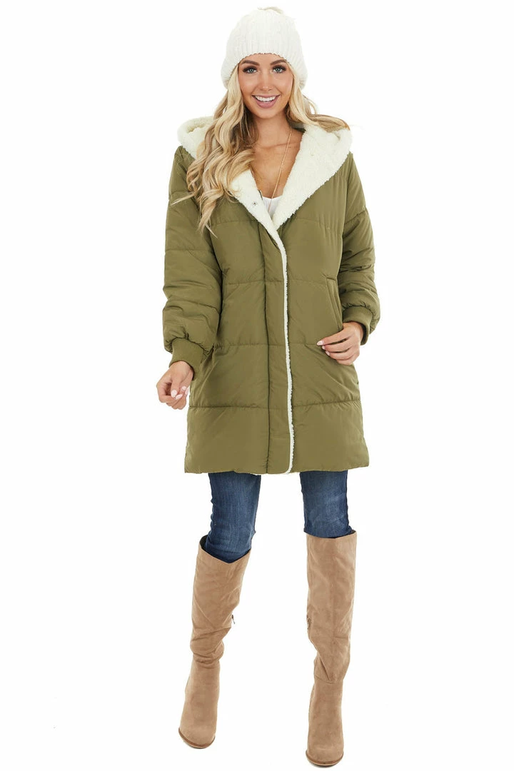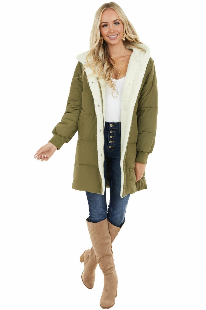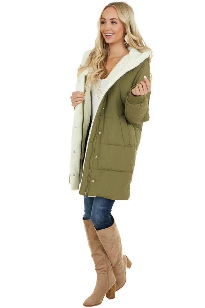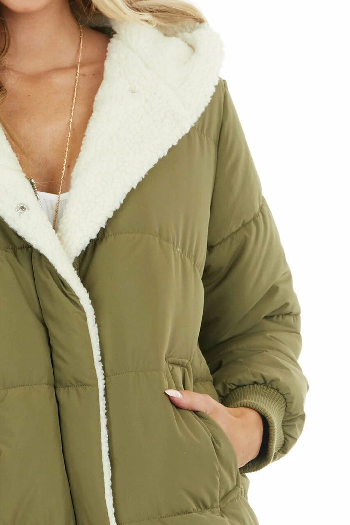 - Olive Hooded Puffer Coat with Button and Zip Up Closure