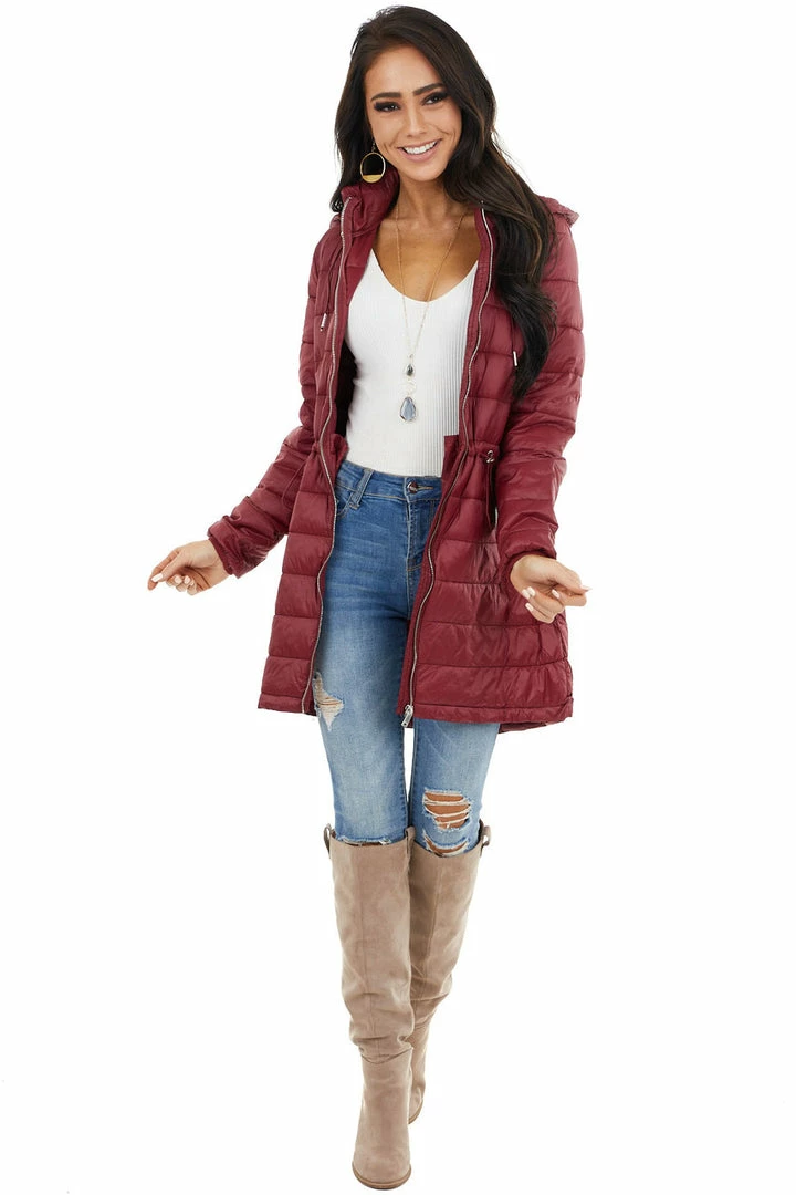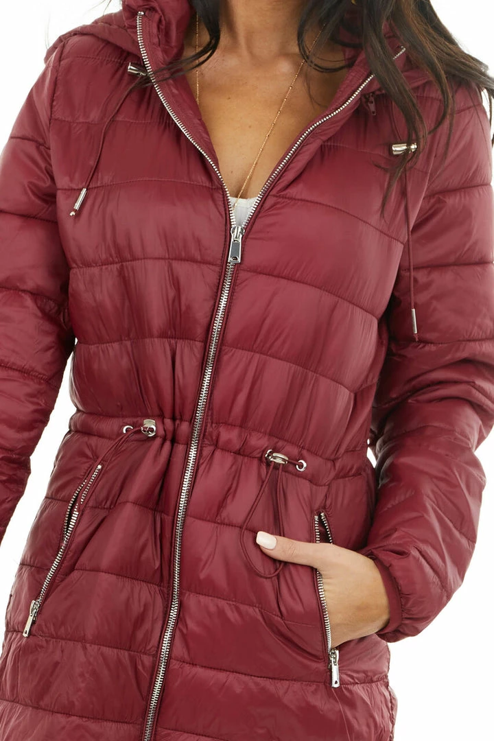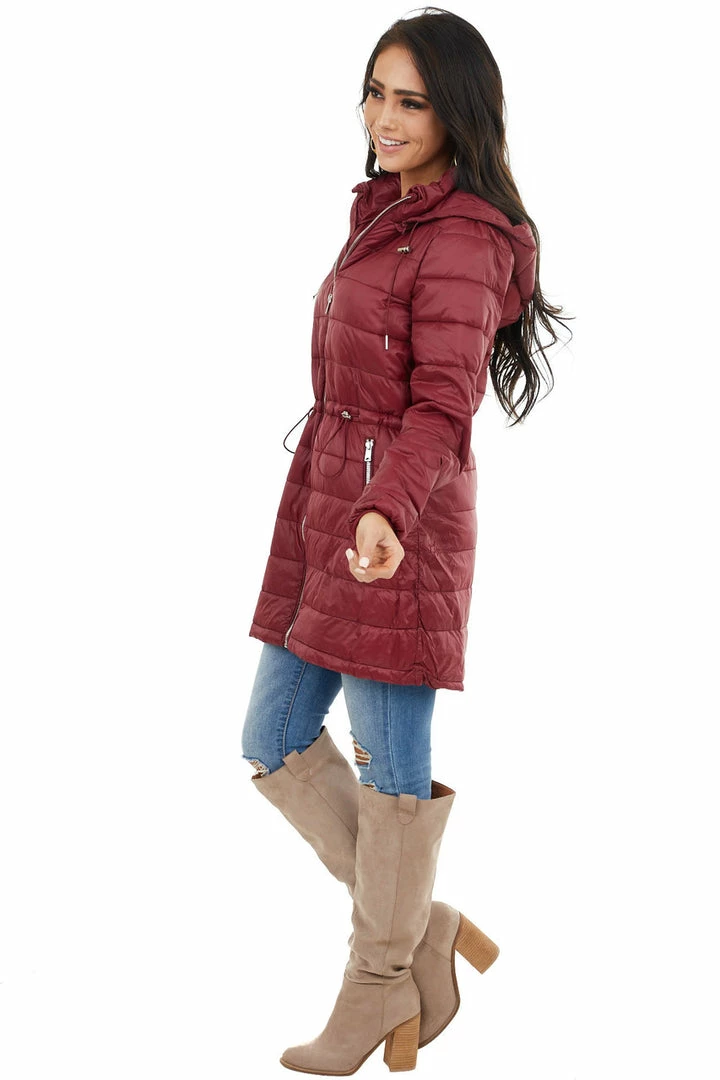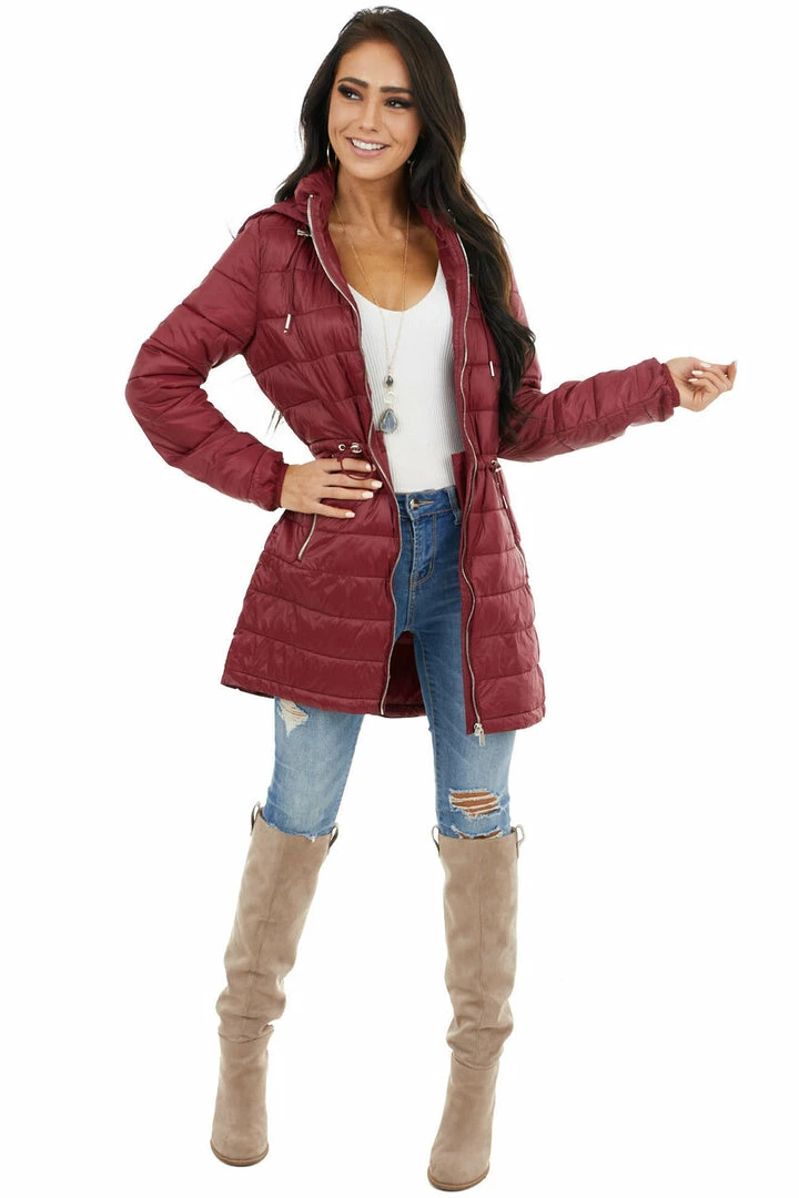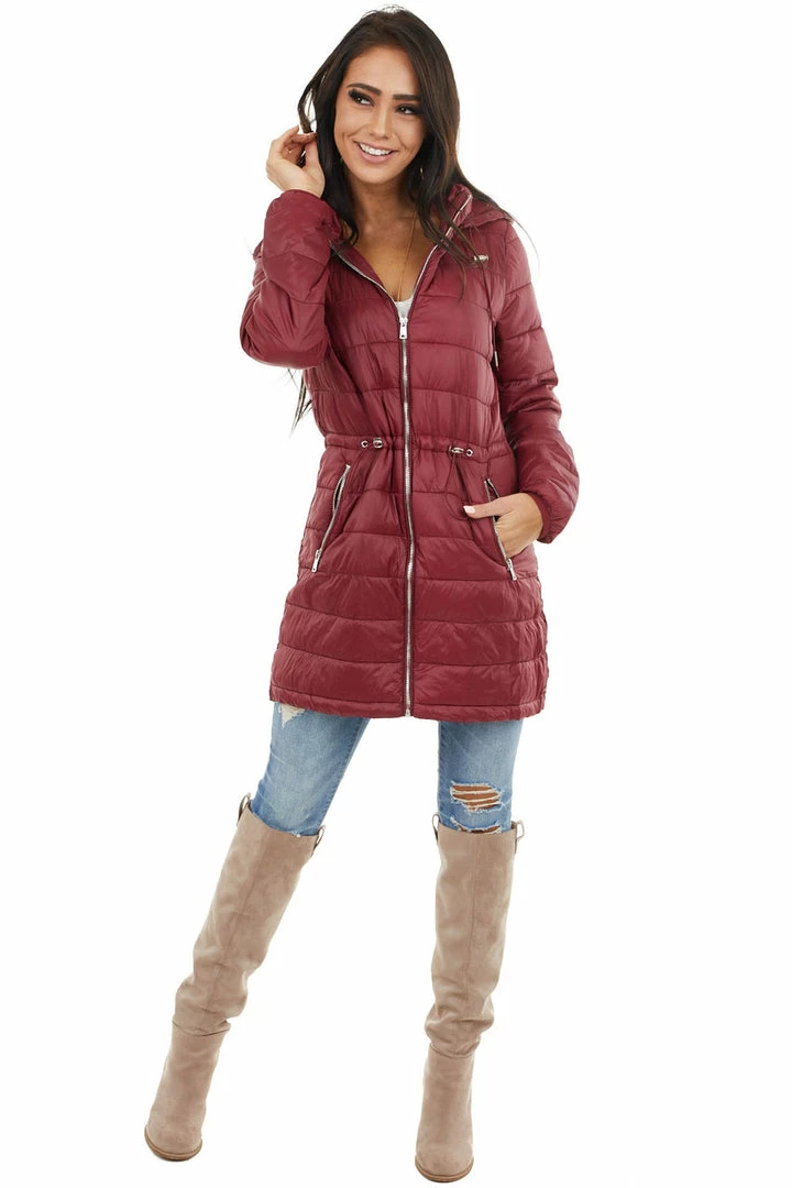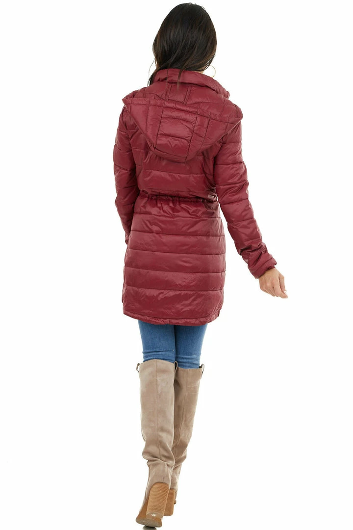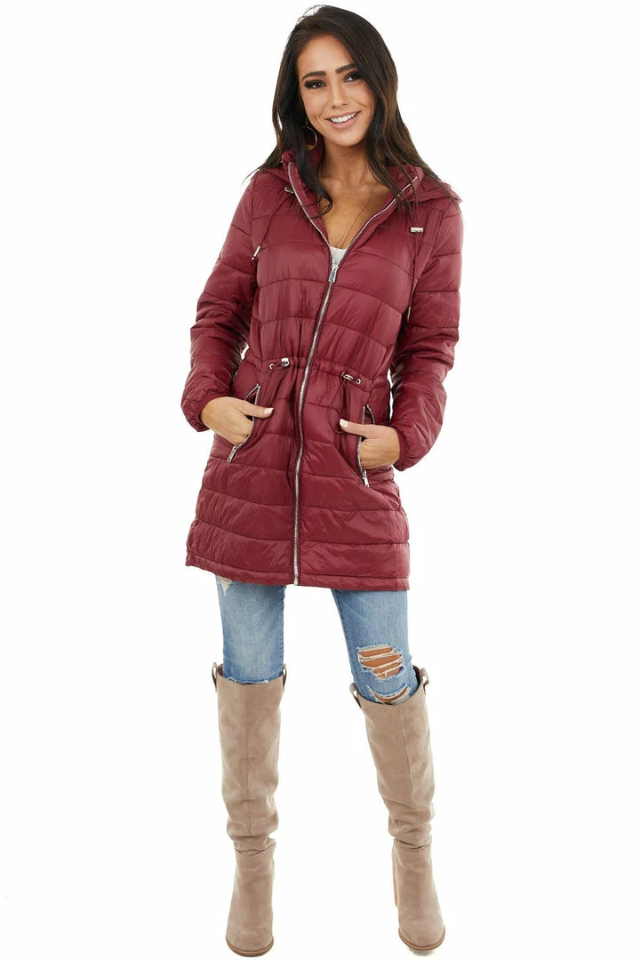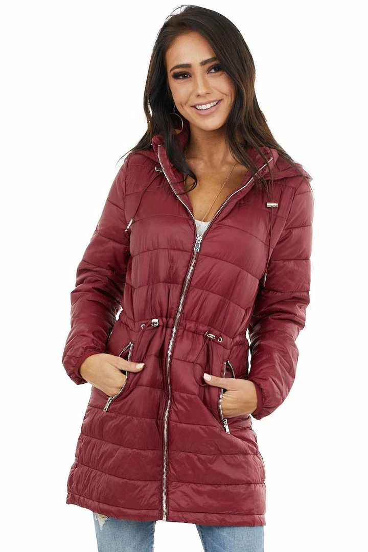 - Wine Zip Up Adjustable Puffer Coat with Removable Hood