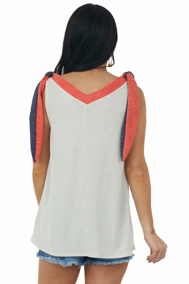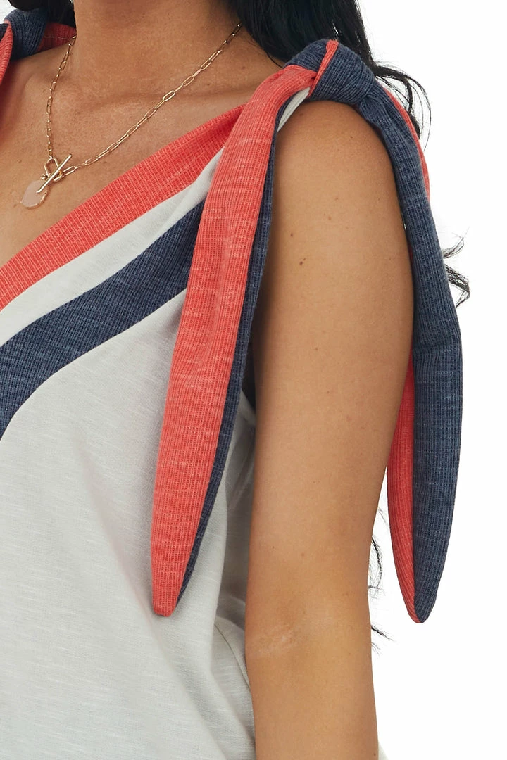 - Oatmeal Chevron Colorblock Tie Strap V Neck Top