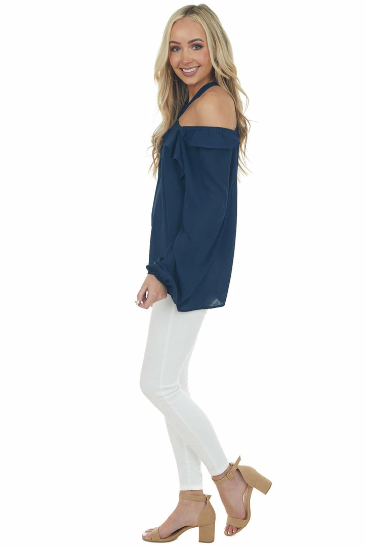 - Navy Halter Cold Shoulder Long Sleeve Blouse