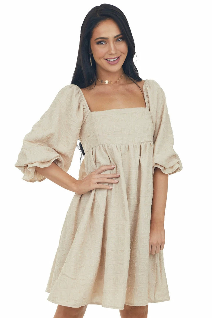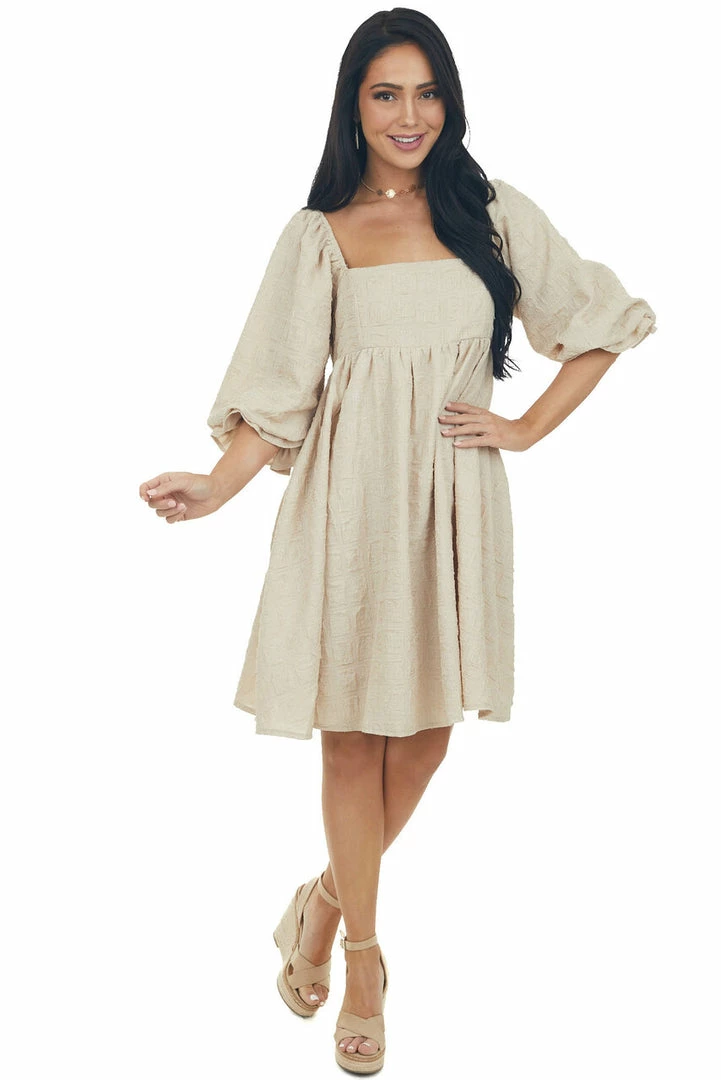 - Beige Textured Woven Babydoll Short Dress