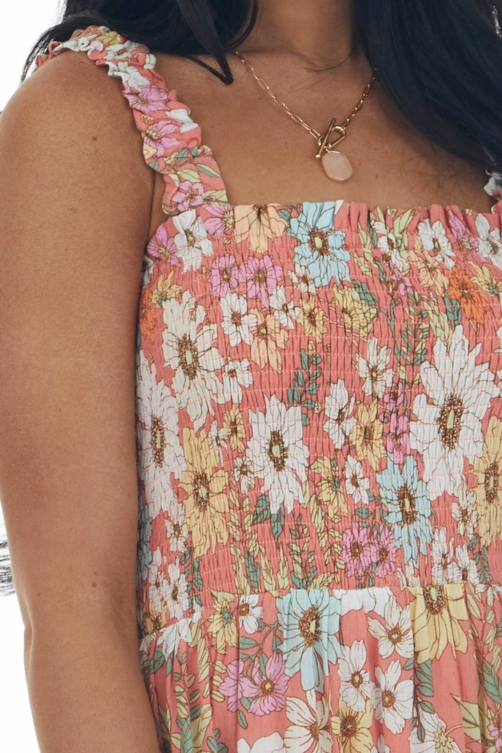 - Coral Floral Print Smocked Woven Midi Dress