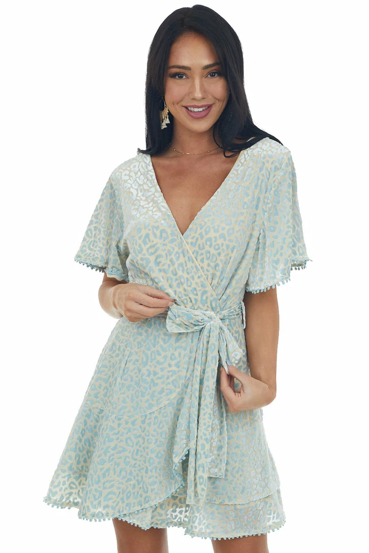 - Baby Blue Leopard Print Faux Wrap Short Dress