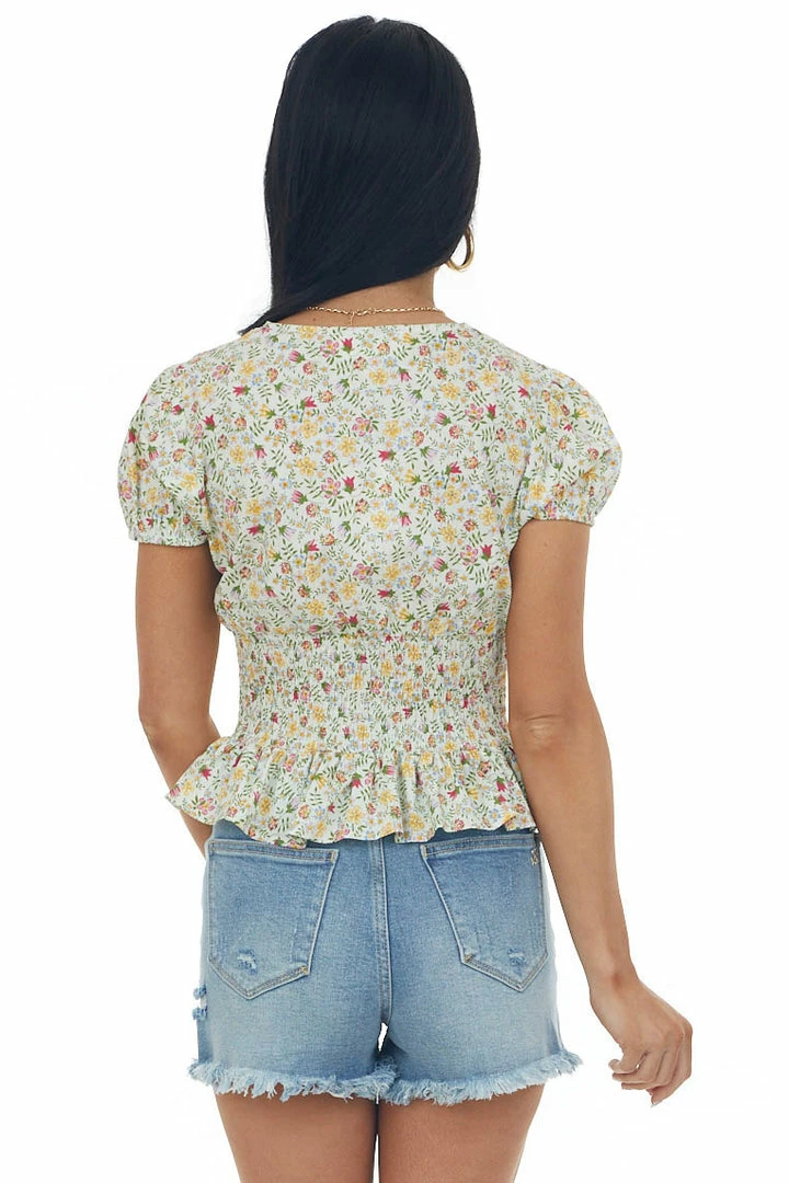 - Light Sage Ditsy Floral Button Up Peplum Blouse